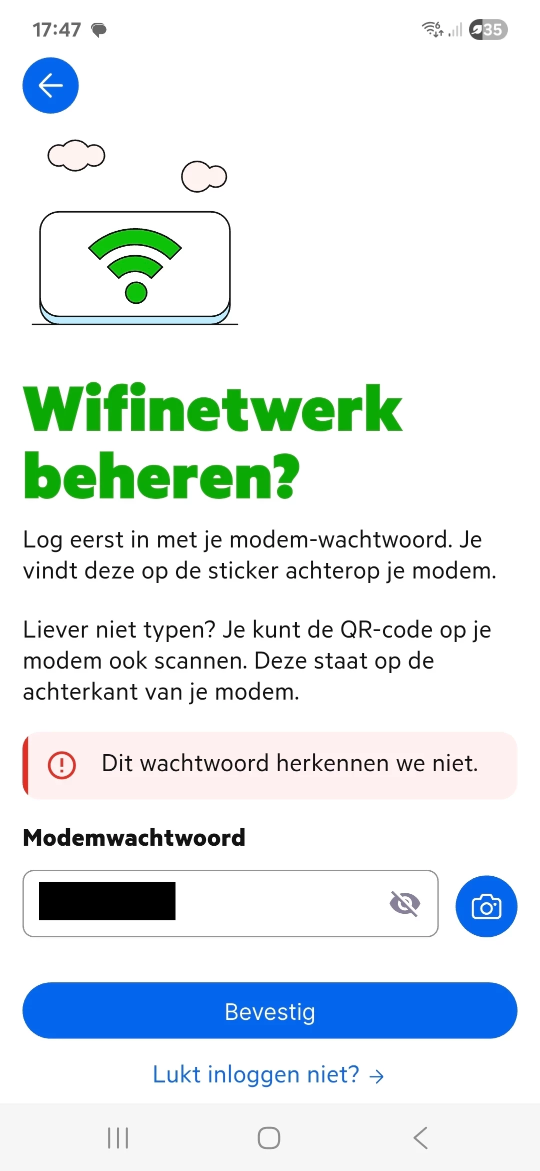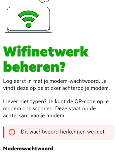 Goed, dan nu het daadwerkelijke probleem: Je geeft aan dat je niet in Wifibeheer via de MijnKPN app komt. Het wachtwoord zou verkeerd zijn. Zoals door communityleden ook al is aangegeven, gaat het om het wachtwoord van jouw modem, niet die van wifi. Daarbij is het ook belangrijk om de leestekens goed te kopiëren, want het is hoofdletter gevoelig.