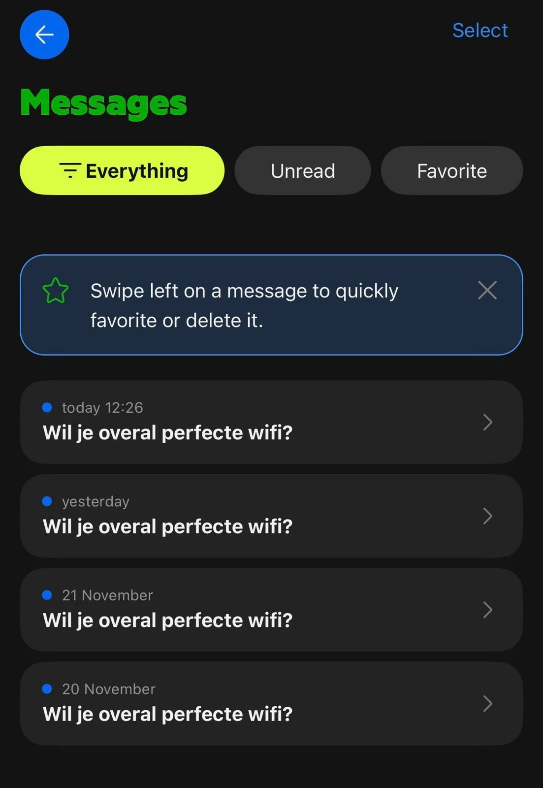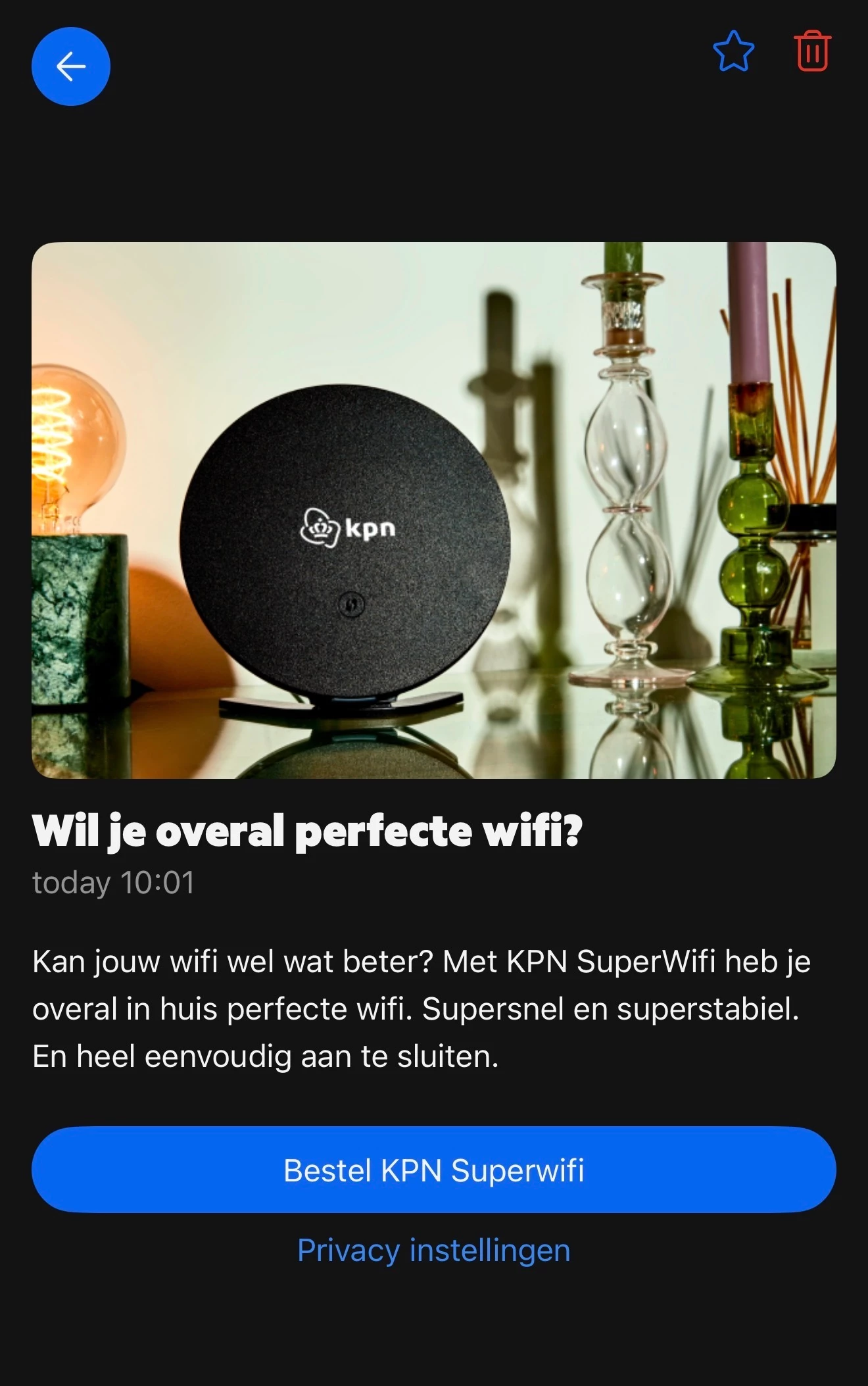Hoi ​@Marcia van KPN, ik heb de berichten al verwijderd dus kan helaas niet meer openen. Anders bleef ik zo een irritante notificatie badge op mijn kpn app icoon behouden vandaar. Het was een reclame boodschap m.b.t. jullie Wifi extenders dienst.