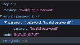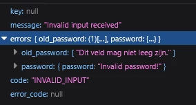 Alleen wanneer ik een wachtwoord van 64 tekens of lager doe, krijg ik de foutmelding: “Helaas is er wat verkeerd gegaan probeer het nogmaals”. In devtools zie ik duidelijk dat het met het nieuwe wachtwoord te maken heeft en niet met old_password (zoals in situatie 1):