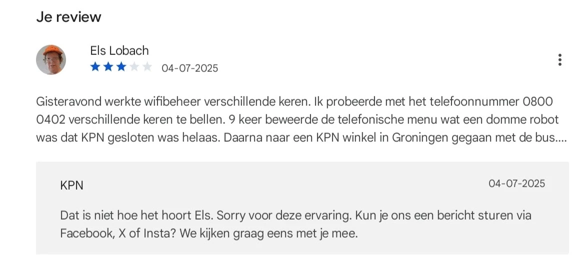 Maar in Google Play store van de tablet Galaxy Tab A8 van Samsung heb ik bij de Mijn KPN app deze review met antwoord wel kunnen bekijken. Raar dat het in smartphone in Google Play store niet zo is. Hopelijk verschijnt het wel met een update van KPN alleen weet ik niet wanneer ik het kan installeren met Mijn KPN. Misschien weet een medewerker of medewerkster van KPN het wel. Zou een medewerker of medewerkster van KPN dat kunnen uitzoeken?