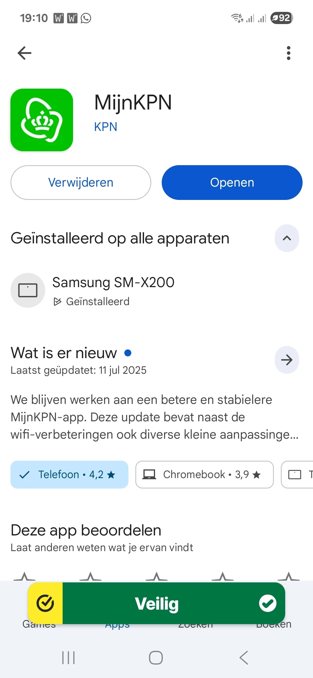 Met de tablet Samsung Galaxy Tab A8 krijg ik met deze server geen rode melding. Super KPN! Want op deze foto is te zien dat de review wat ik eergisteren geplaatst had en een reactie van de ontwikkelaar van Mjjn KPN niet te zien is met smartphone S21 FE in Google Play store.
