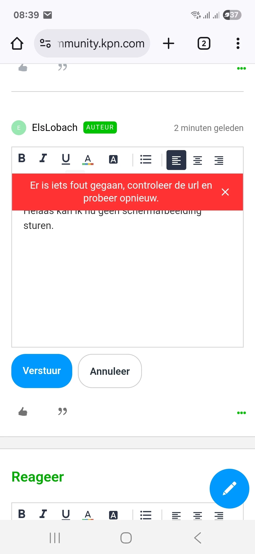 Ook de KPN Community kan soms even niet werken. Door de pagina te verversen, dus opnieuw te laden, kan je dit vaak oplossen. Dan kan je jouw bericht alsnog plaatsen.