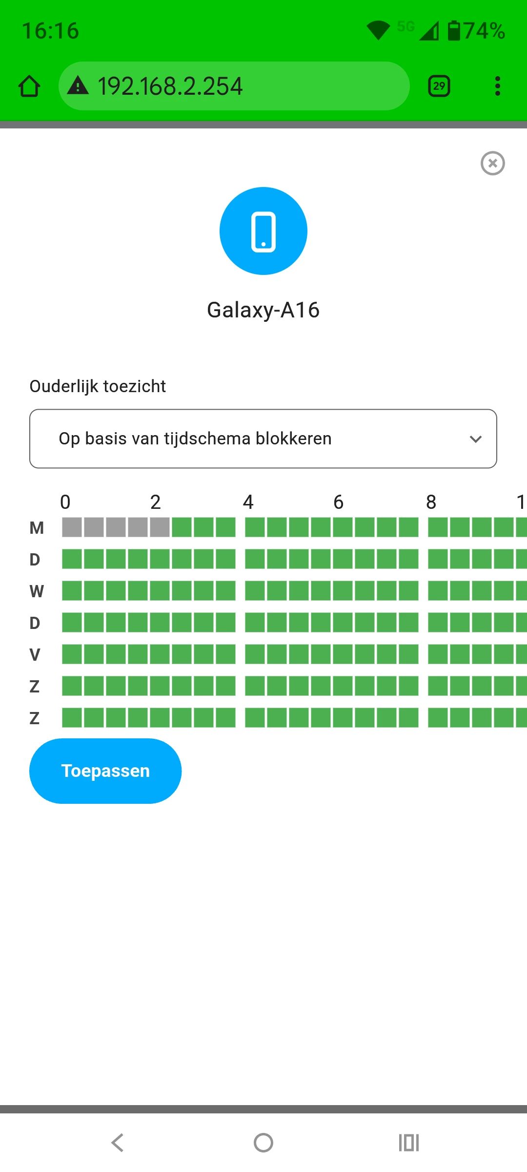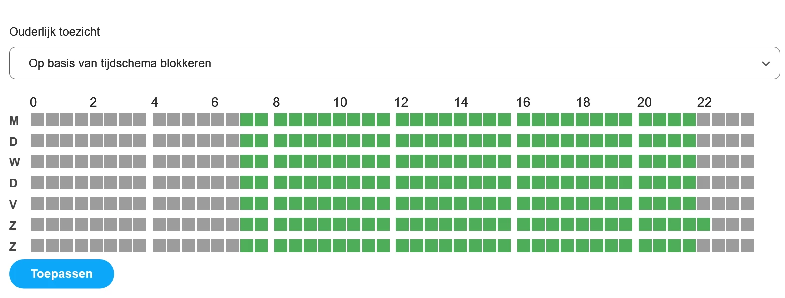 In je screenshot is het groene de selectie. Dus als je in het drop-down menu hebt gekozen voor “ Op basis van tijdschema blokkeren” is groen de tijd dat het internet geblokkeerd is.