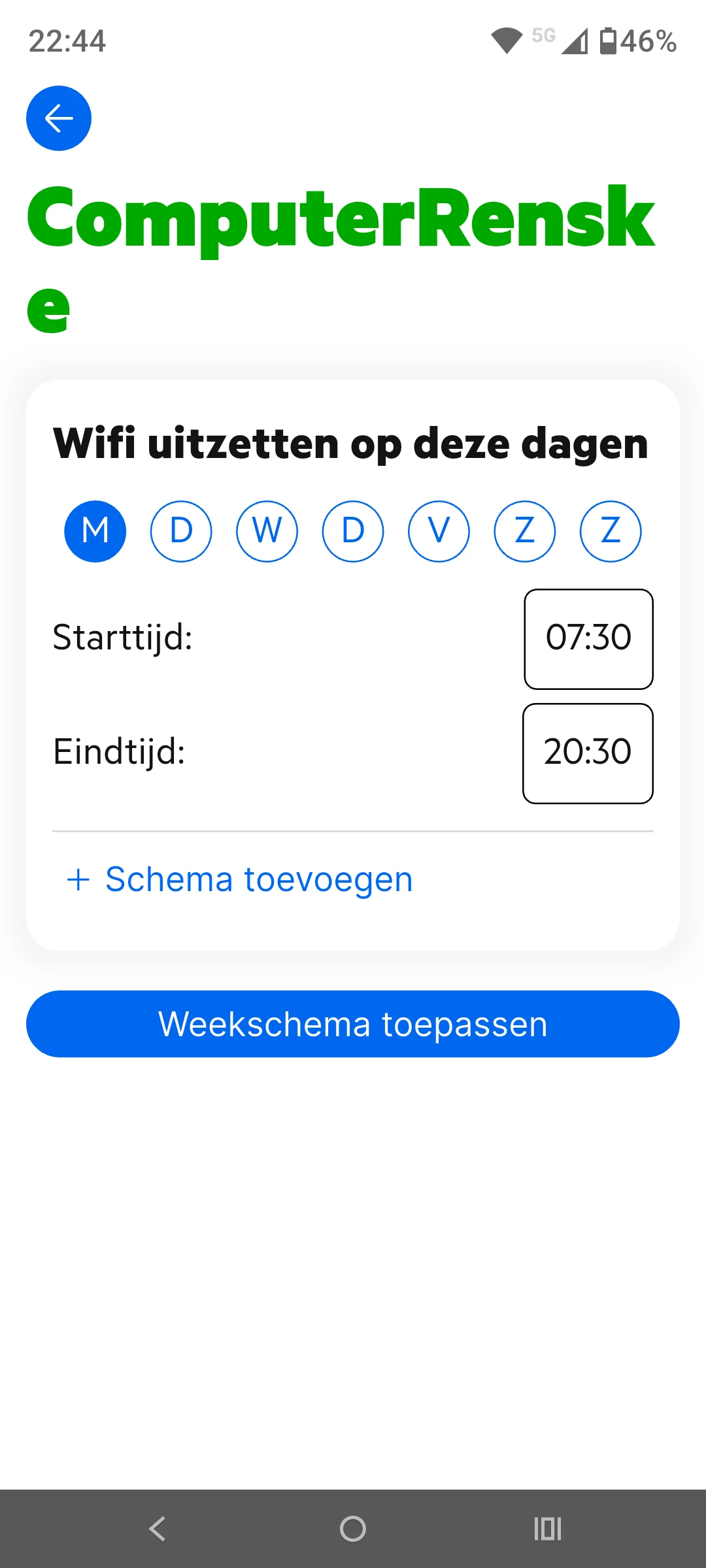 Ik klik in de kpn app bij mijn verbonden apparaten op een device. Vervolgens stel ik een schema in, zie bijlage. Ik klik op schema opslaan maar er wordt niets opgeslagen. Heb kpn app al verwijderd, cache en opslag verwijderd, maar dat helpt niets