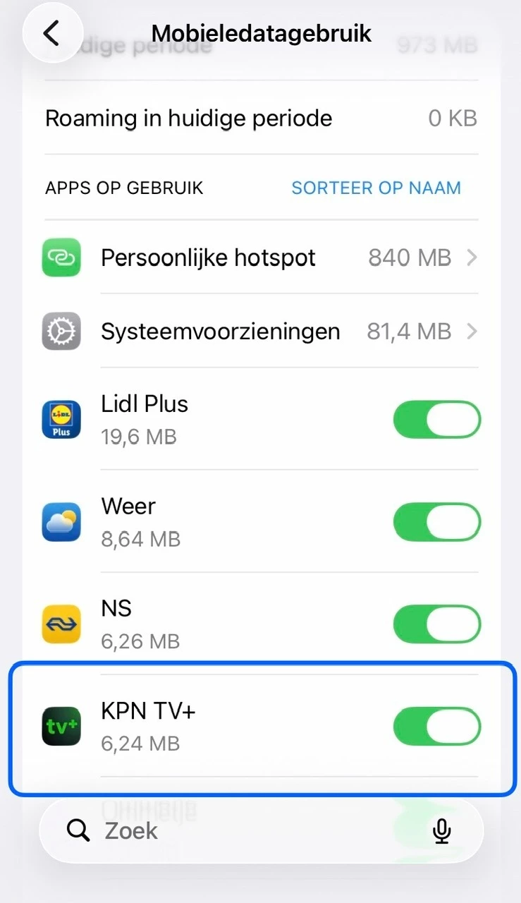 Op iOS kun je in systeem Instellingen mobiel datagebruik per app aan-of uitzetten voor elke app, dus ook de KPN TV+ app.