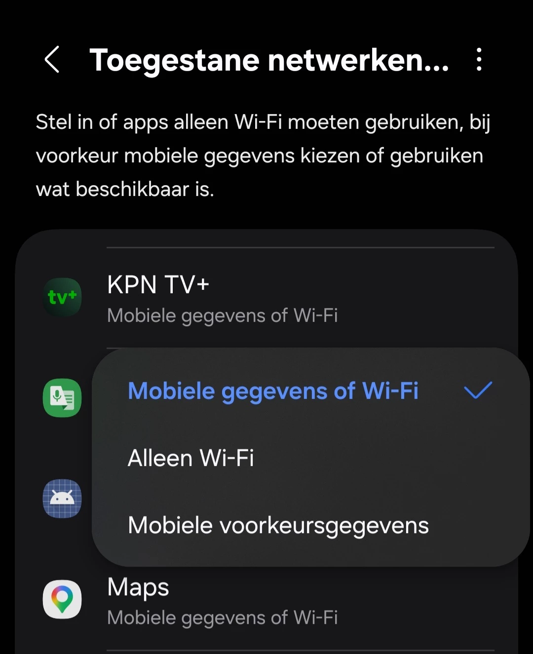 Helaas heeft m'n oude toestel (A40, Android11), waar het om gaat, net Toegestane netwerken per app niet. M'n nieuwe wel, maar daar gaat het dus niet om.