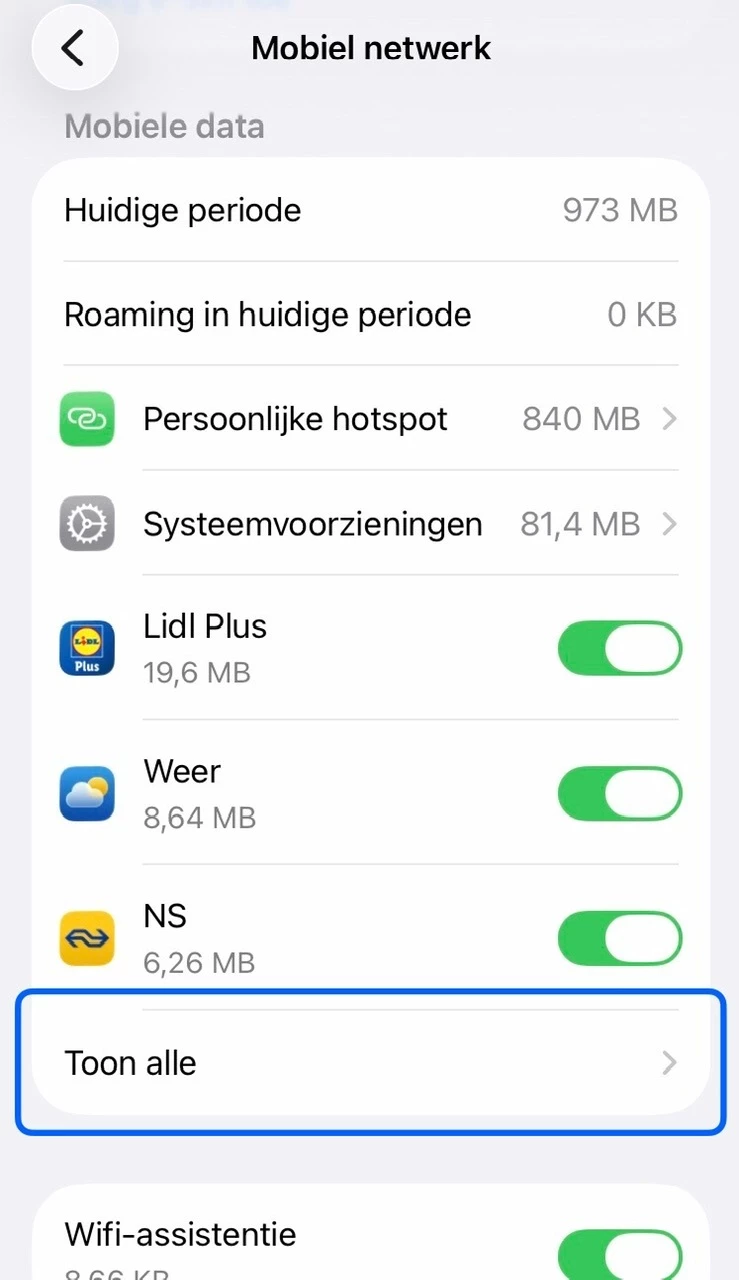 Instellingen : Mobiel netwerk, onder Mobiele data, Toon alle >