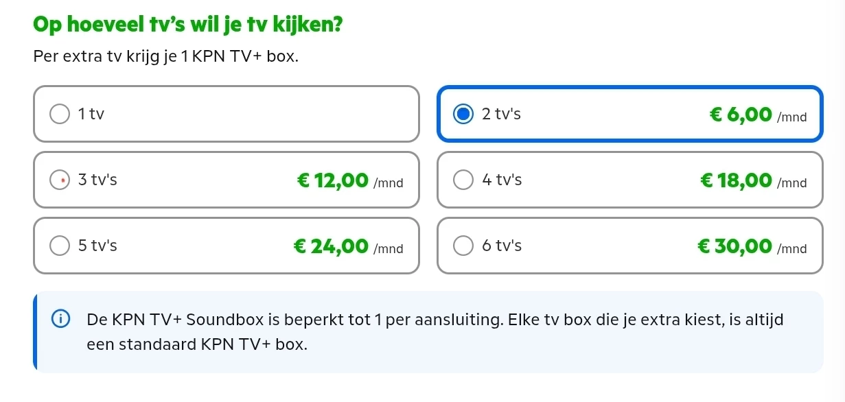 Wel is het zo dat je op de bestelling ziet TV+ met TV+ Box 12.50 en een streep erdoorheen, gevolgd door TV+ met TV+ Soundbox 18.50. Omdat je in plaats van 12.50 euro per maand, 18.50 euro per maand betaalt als je een Soundbox afneemt in plaats van een TV+ Box. Je gaat dus geen 18 euro éxtra betalen.