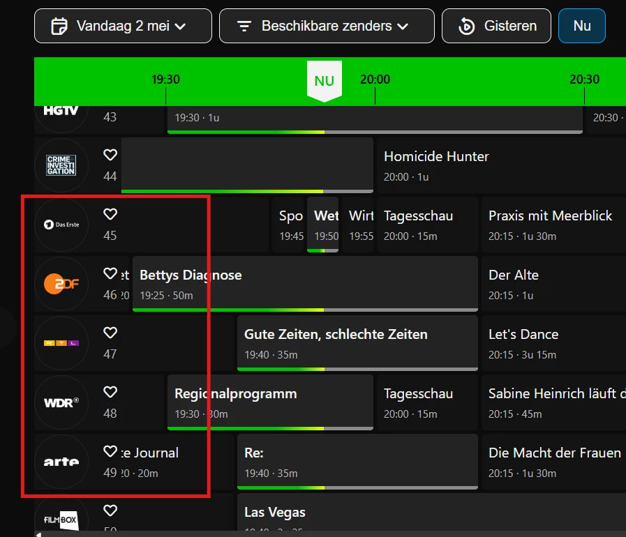 Klopt ​@PeterG . Vandaar ook dat ik op deze manier probeer opnames te plannen. Het is trouwens vrij wispelturig: begin van de avond waren die zenders weer verdwenen, ook stond de keuze op 'alle zenders'. Nu zijn ze er weer. Er gaat dus duidelijk iets niet goed.
