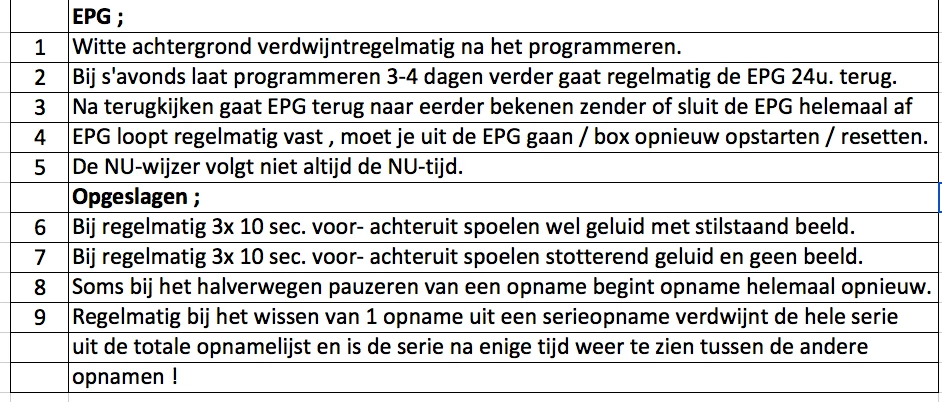 Ik begrijp ook dat de ene persoon zal intensiever de EPG , Opgeslagen en voor- en achteruit spoelen gebruiken dan de ander en zal totaal andere ervaringen hebben met het hele systeem maar toch.        Mijn oude ARRIS VIP 2952 vertoonde toen der tijd kuren dat er regelmatig en langdurig een zwart beeldscherm te zien was , ik ga nu toch twijfelen of dit wel aan de Experia- of 2952-box heeft gelegen nu ik dit allemaal meemaak.