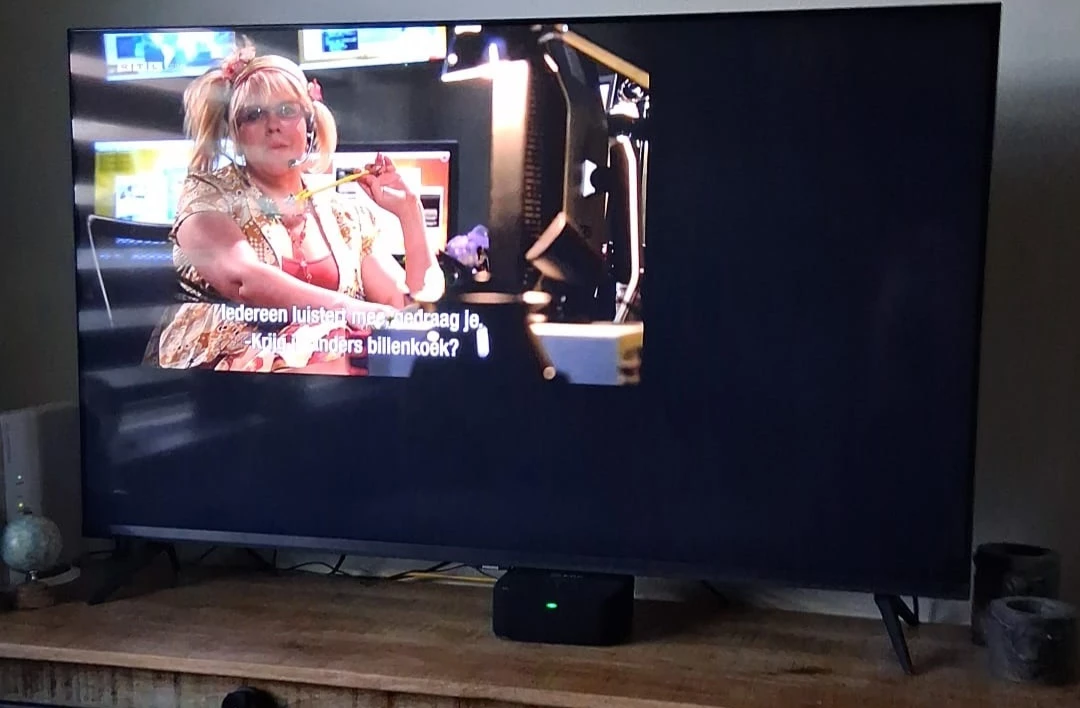 Vandaag al 2x opnieuw moeten opstarten, op de foto oe het beeld eruit ziet. Mijn tv is ook een Samsung QLED 55Q74B