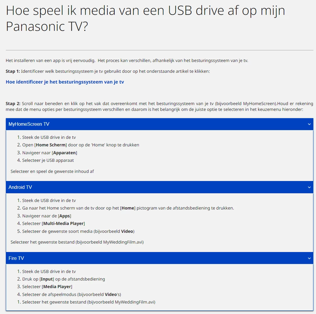 ik heb op een usb stick een aantal fotos die ik via de tv will vertonen. De tv (panasonic) heeft 3 usb ingangen, maar als ik een stick daar plaats gebeurt er niets. Kpn+ schijnt alle instellingen over te nemen van de tv, want volgens de handleiding van de tv zou de usb direct moeten afspelen. En dat doet t dus niet..