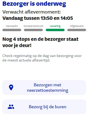 zonder enig bericht aan ontvanger en verzender moet aan post.nl-bezorger plots een nummer gegeven worden. Handtekening (zoals afgesproken en altijd vereist geweest) ? Nee, u moet een nummer hebben.  PostNL app: nada, niets, geen "hulp” … Misschien e-mail … pc opstarten doet / mobiel opstarten doet / tablet opstarten doet … bezorgen moet dus wachten en wachten…. Voorheen: handtekening : duurt 1 seconde, bezorger hup naar volgende bestelling maar nu: je pc/mobiel/tablet uren aan laten en wachten, wachten, wachten op e-mail met dat nummer…. ….. deze "oplossing” is zeker verzonnen  met AI want een normaal denkend mens KAN zoiets doms NIET verzinnen, toch???
