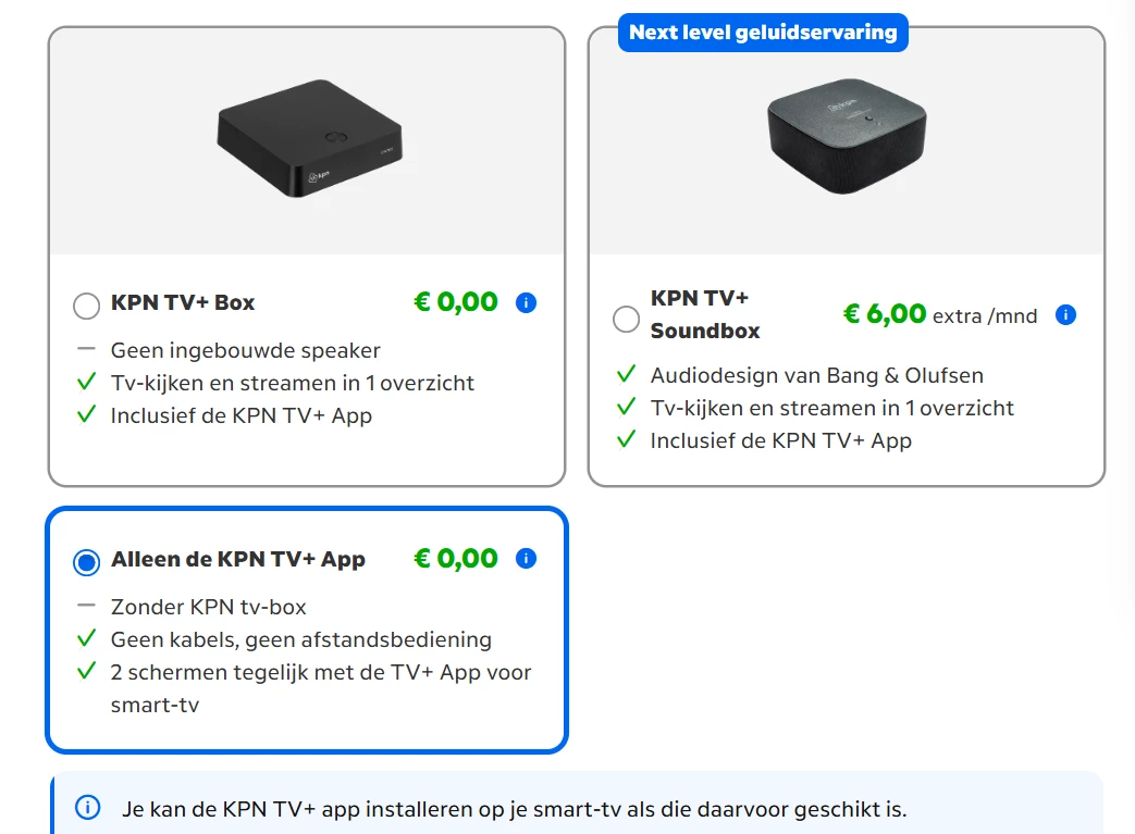 Welke optie je ook kiest: Je hebt, zoals ​@joop2011 zegt, een KPN TV abonnement nodig. De prijs hiervan vind je op onze website (Internet en TV abonnement voor bij jou thuis) of in MijnKPN. Je kunt hiezen voor alleen TV, zonder tv-box, of je kiest voor het abonnement inclusief de tv-box. Er is geen goed of fout, het gaat echt om jouw voorkeur. Sommigen vinden de tv-box het beste, anderen vinden de Smart TV app prima. Wat jij wil ;)