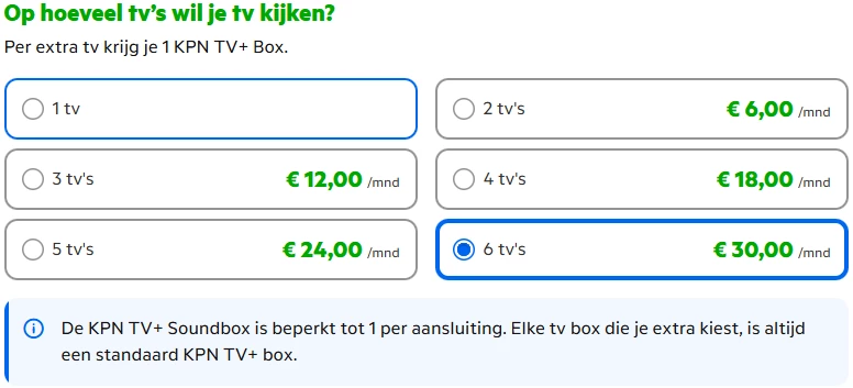 Maar als ik het nieuwe systeem wil ,dus de ontvanger met soundbox betaal ik 6 euro extra boven op het basispakket dus kpn+met ontvanger met soundbox komt dan op 18,50 euro.