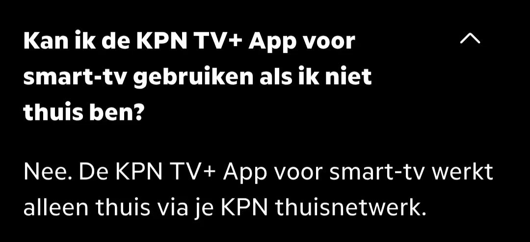 Hallo ik heb een tv meegenomen naar spanje voor de vakantie thuis de app gedownload en geprobeerd werkte goed maar eenmaal op de camping aangekomen vraagt de app om in te loggen maar dat gaat niet omdat ik niet op het kpn netwerk zit is daar een andere manier voor