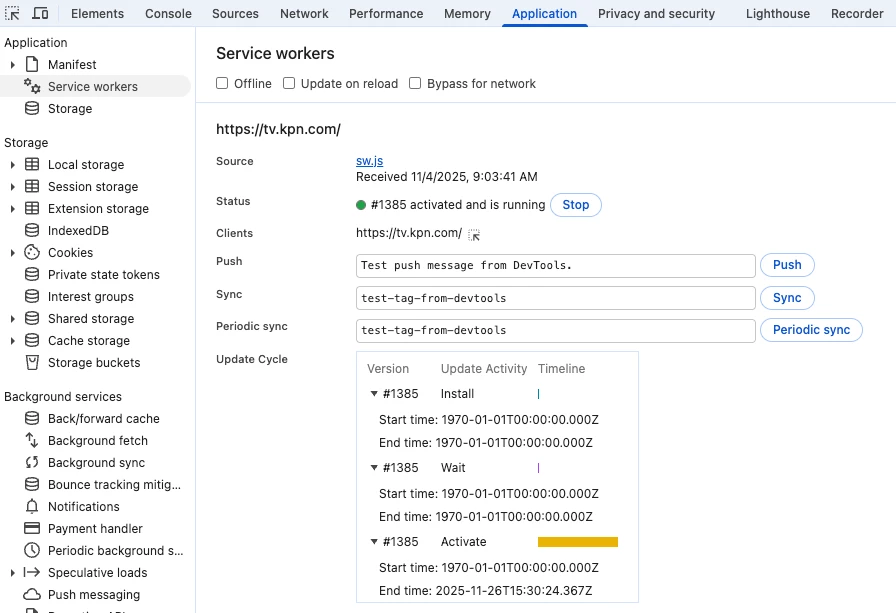 Service workers in Application in developer tools in PWA van tv.kpn.com
