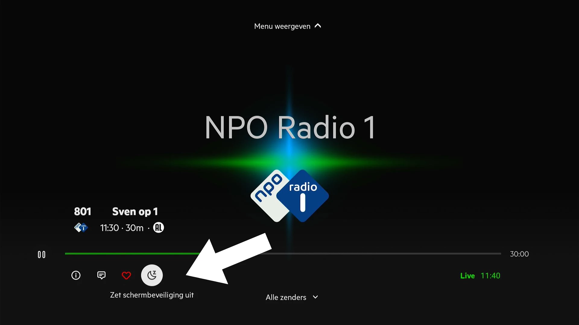 Als je de radiozenders luistert van KPN dan kan je het scherm op zwart zetten door de onderstaande knop te gebruiken.