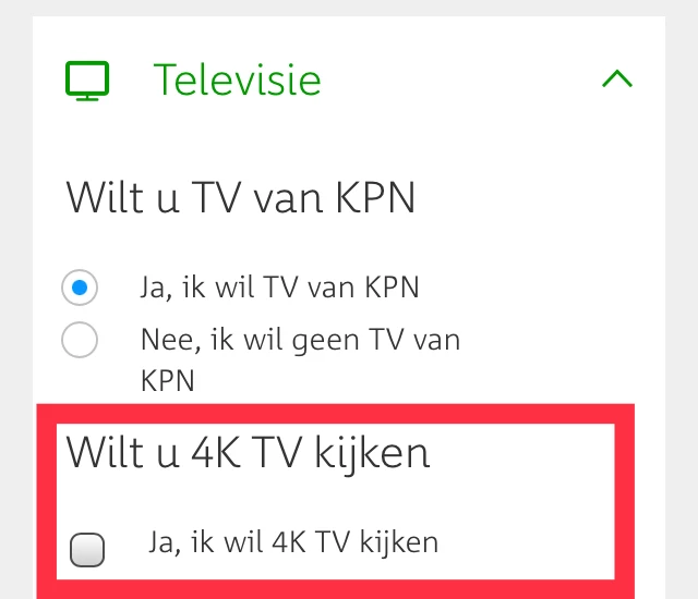 Ik zie de mogelijkheid om het 4k pakket aan te vragen niet in mijn opties staan bij KPN bij mijn huidige Hussel Internet 100 Mbit/s pakket. Dat betekent waarschijnlijk dat mijn bandbreedte onvoldoende is?