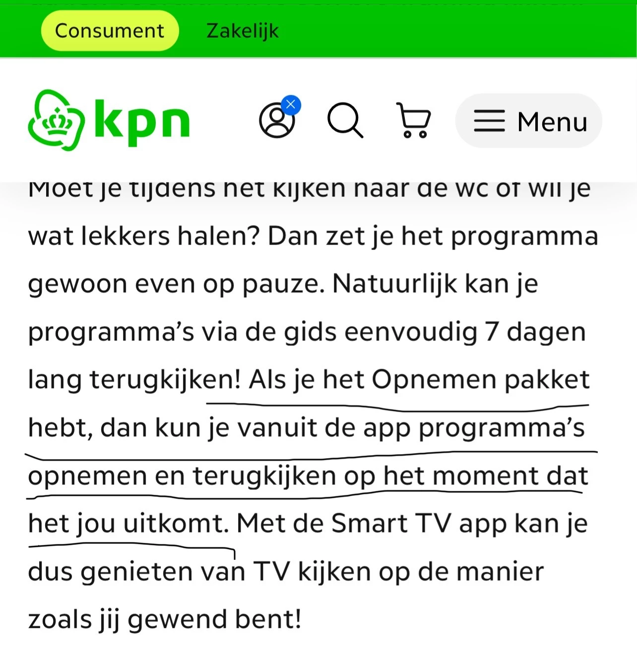 De zin “met de Smart TV App kan je dus genieten van TV kijken op de manier zoals jij gewend bent!, wekt de indruk dat de Smart TV App, al dan niet in combinatie met het opnemen pakket, dezelfde zenders en functionaliteiten biedt, als kijken via de ontvanger, als je dat gewend bent.