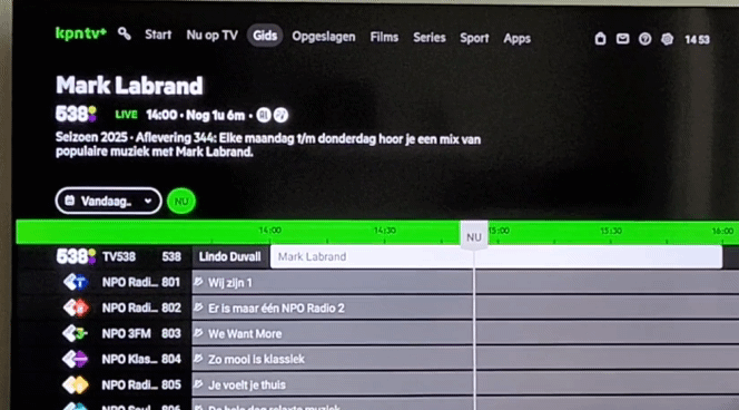 Zie hieronder: TV538 is de laatste TV zender (programma informatie: Mark Labrand) en je ziet dat de programma informatie erboven niet meer mee gaat bij de radiozenders.