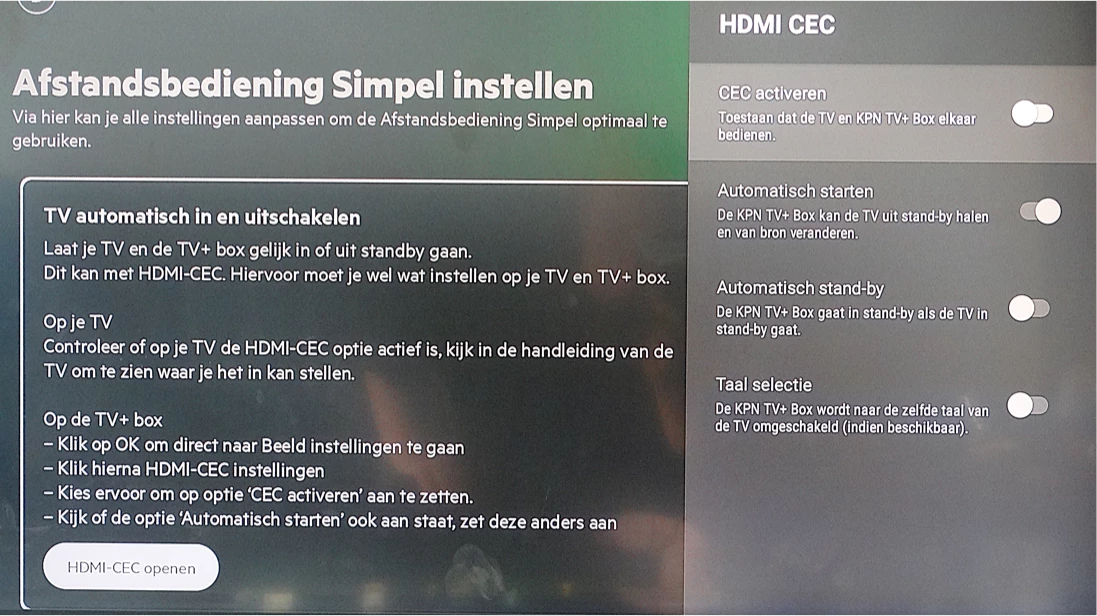 Wat bedoel je precies met “KPN heeft de HDMI-CEC ook ingesteld”? Is deze functie toen gecontroleerd of ook volledig uitgezet? Zou je deze eventueel toch nog eens helemaal kunnen uitschakelen? In het screenshot hierboven zie je waar je die instelling kunt vinden.