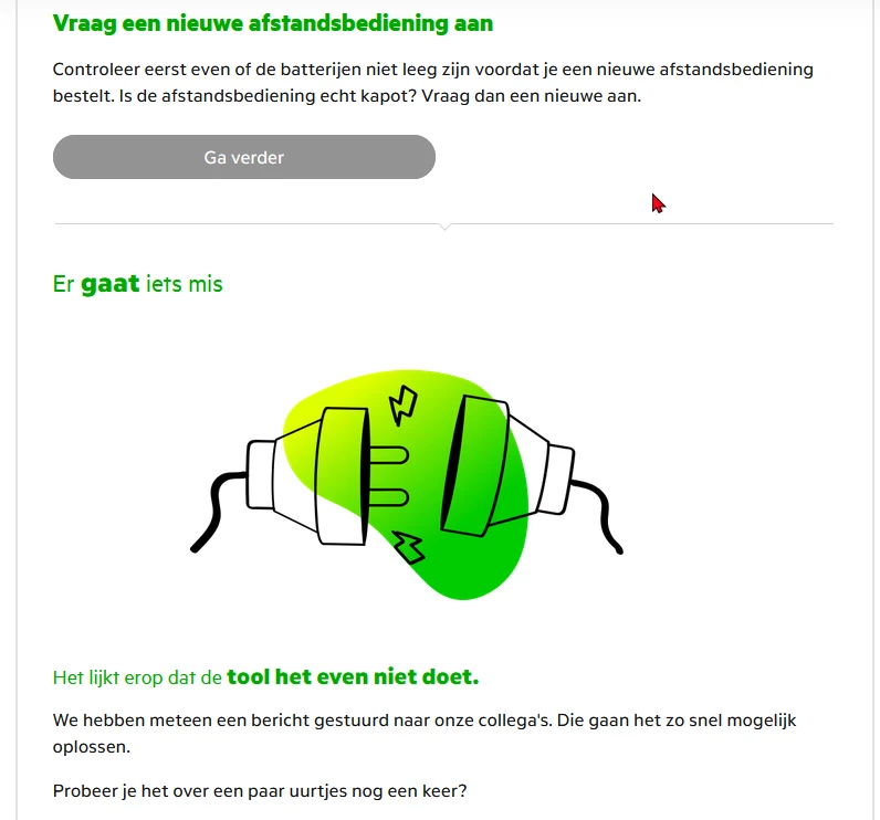 Ik wil een nieuwe afstandbediening aanvragen maar de link/website waar dit kan werkt niet. Ik krijg onderstaande melding te zien.