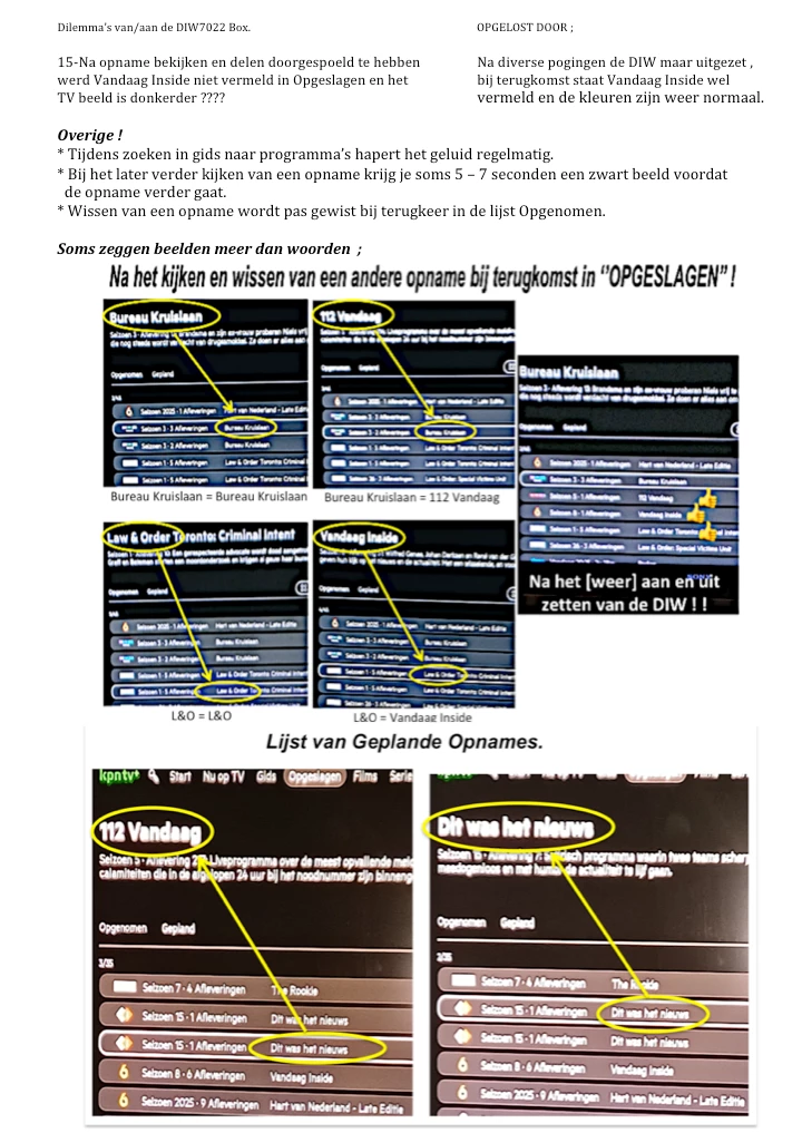 Wanneer je veel tv kijkt via de lijst Opgeslagen en je wil de volgende opname bekijken dat wordt opgenomen zie je niet tot waar het al opgenomen is zoals bij het terug kijken , dit is in mijn manier van TV kijken een min puntje van de DIW.