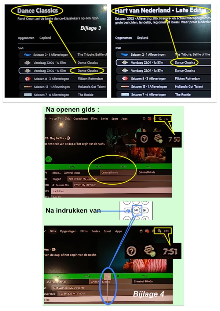 • Over het laatste plaatje met de balk bij terugkijken versus een opname: In de eerste afbeelding is sprake van Begin Gemist (even als onderscheid) waarbij je een programma terugkijkt via de gids, terwijl dat programma nog bezig is. Die witte lijn is er om aan te geven waar het livemoment van de uitzending zit ten opzichte van waar jij bent met terugkijken. Het programma dat je kijkt, is nog niet afgelopen, en daarom ziet het er een beetje anders uit 😊Bij een opname die al helemaal klaar is, is punt A het begin van de opname, punt B de plek waar jij bent met kijken en punt D is het einde van de opname.