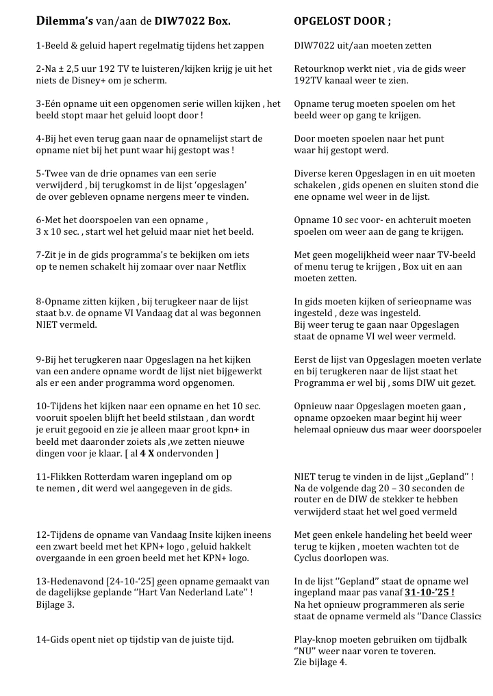 Het is geen groot probleem maar vindt het wel jammer dat het kanaalnummer niet meer zichtbaar is op de Box , ik gebruik de Box ook voor mijn Home Cinema set om alleen naar muziek te luisteren zodat de TV niet aan hoeft.  Het is natuurlijk ook even wennen maar ik wel een idee/tip voor de KPN en meedenkend aan de ouderen onder ons [ik ben 70] , om de DIW 7022 Box uit te leveren met gewoon de basisinstellingen , dan heb je na het aansluiten direct TV tot je beschikking.  Nu krijg je van alles in beeld behalve de TV-beelden zelf en is het toch een heel gezoek in het menu om dit in te stellen , de mensen kunnen dan later zelf het menu zo aanpassen zoals zij dat zouden willen.  Als je b.v. al jaren aan een Arris 2952 gewend bent.