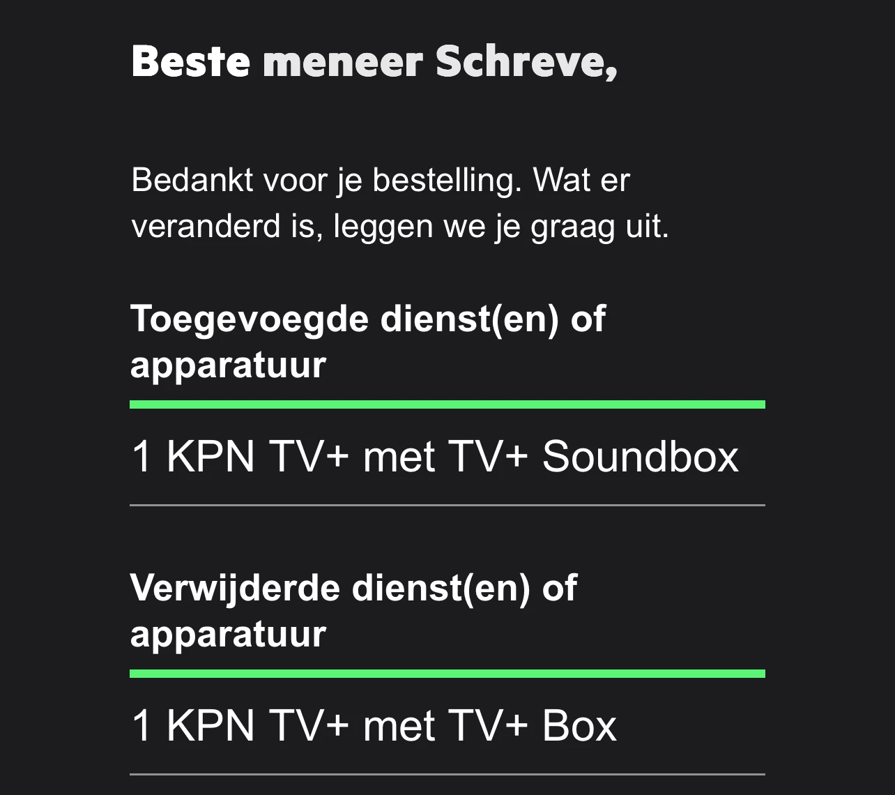 Conclusie is: ik zal de oude 3 iTV boxen moeten omruilen naar 3 KPN TV+ Soundboxen. Dan betaal ik in totaal zo’n 30 euro, waar ik nu 23 euro betaal. Dat is nog wel te overzien ;-). Echterrr, mijn huidige contract loopt nog tot april 2026, kan ik deze bestelling nu dan al doen of moet ik tot april wachten?