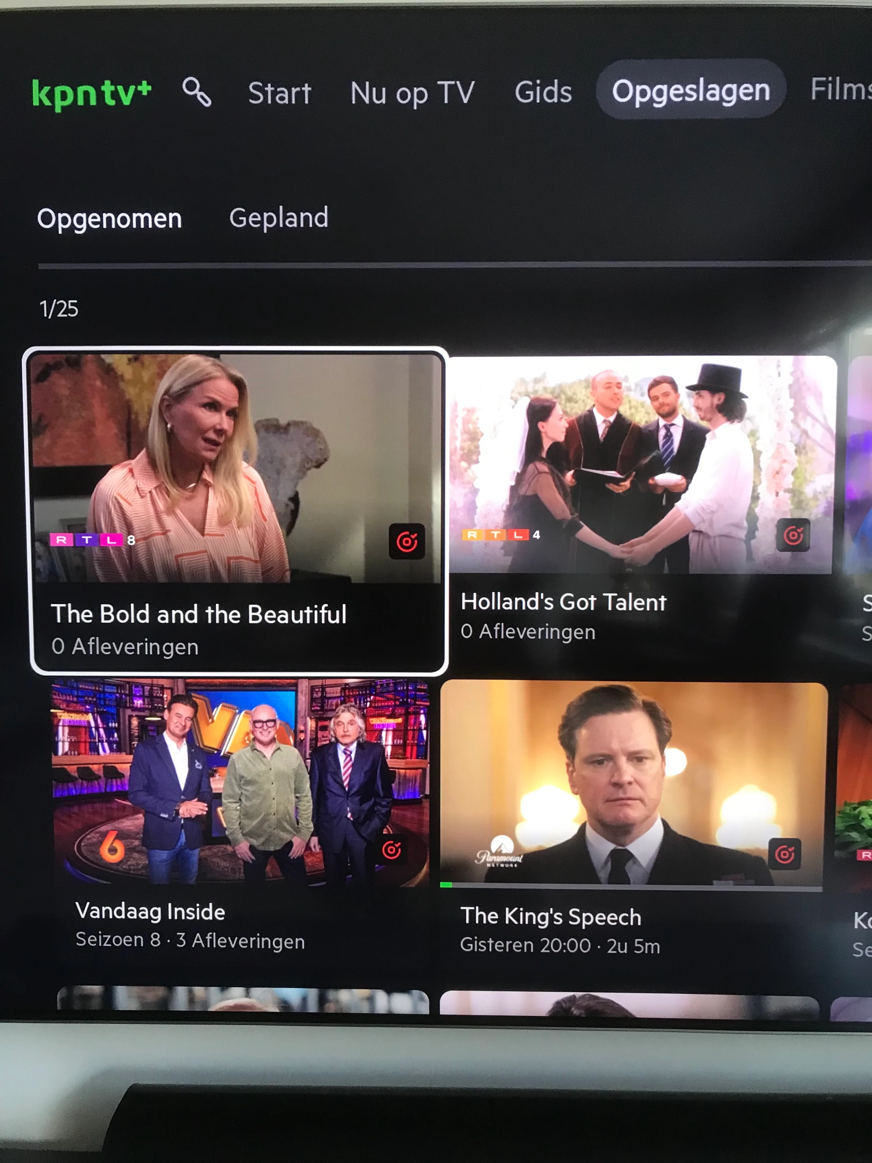 Voeding ontvanger uitgezet en reset gedaan. Geen veranderingen gezien. Na verder onderzoek blijkt dat in ons geval de bolt… en BGT wel opgenomen is en niet via ‘opgenomen’ gezien is maar wel via de gids. Daar kan ik doorspoelen zoals elk ander opgenomen prog.,dus is geen terugkijken. In de tegels staat wel een bolt en BGT maat ook een 0. Deze 2 tegels kan ik ook niet verwijderen. Ik stuur 2 foto’s van het scherm.