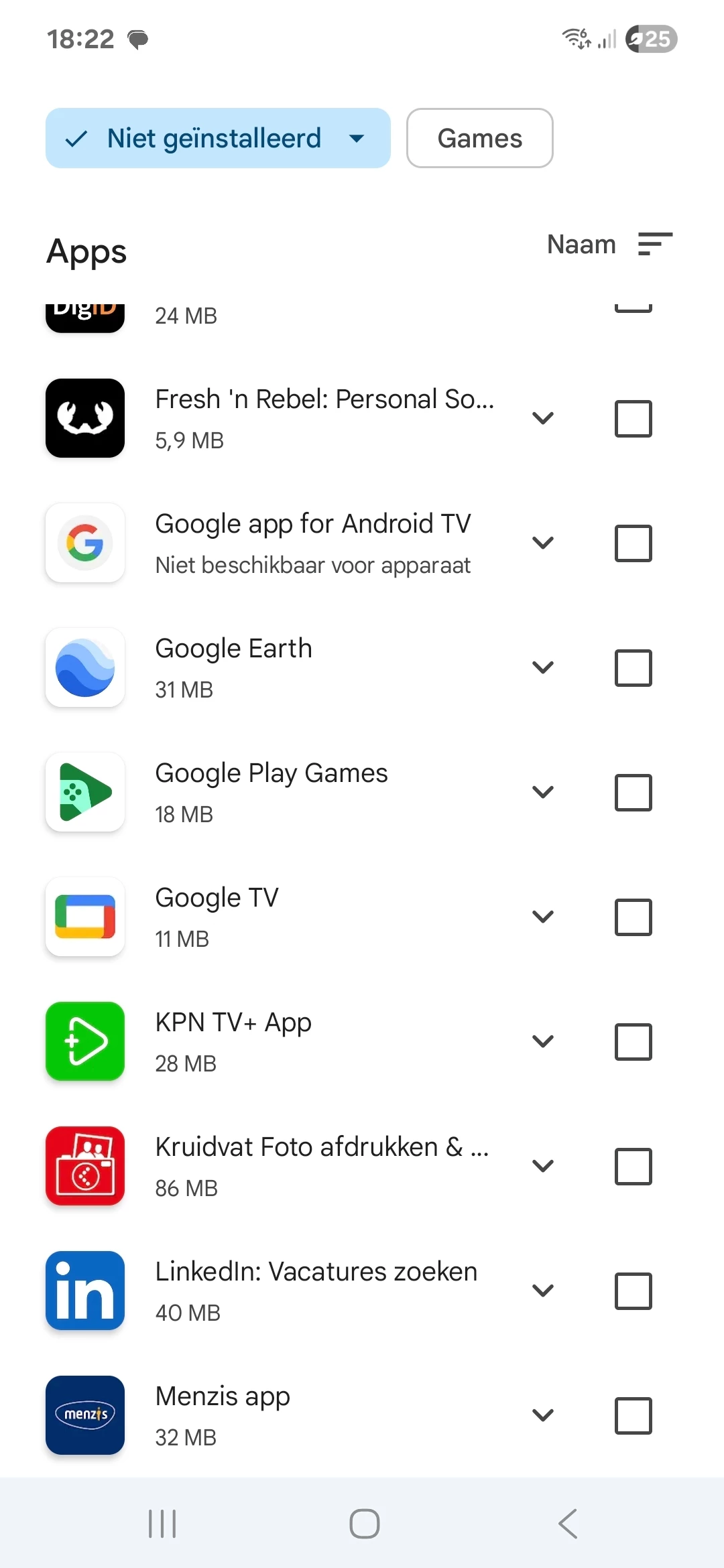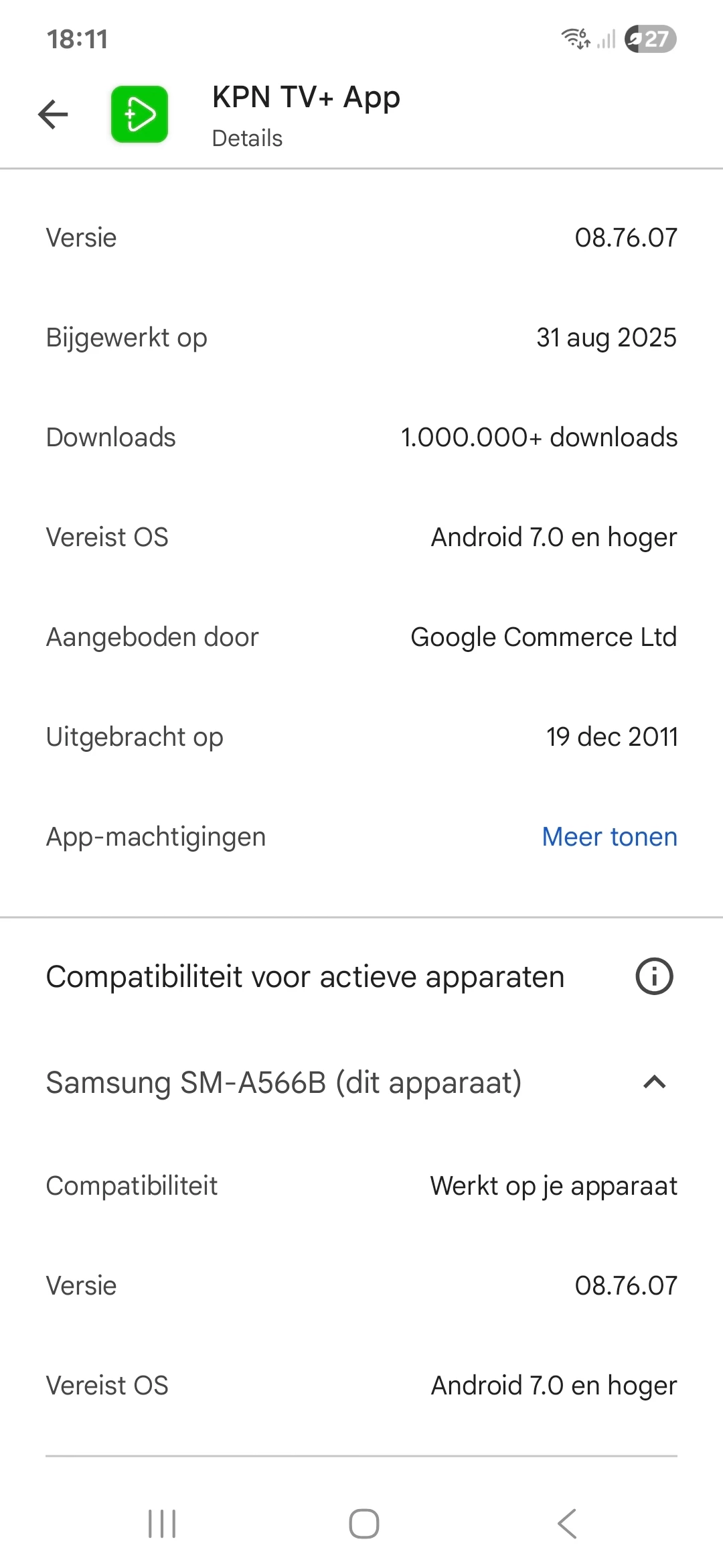 Cachegeheugen heb ik van KPN TV gewist en ook gegevens gewist maar helaas. Ga KPN TTV wat ik nu in deze lijst van Google Play store heb opnieuw installeren in de smartphone A56