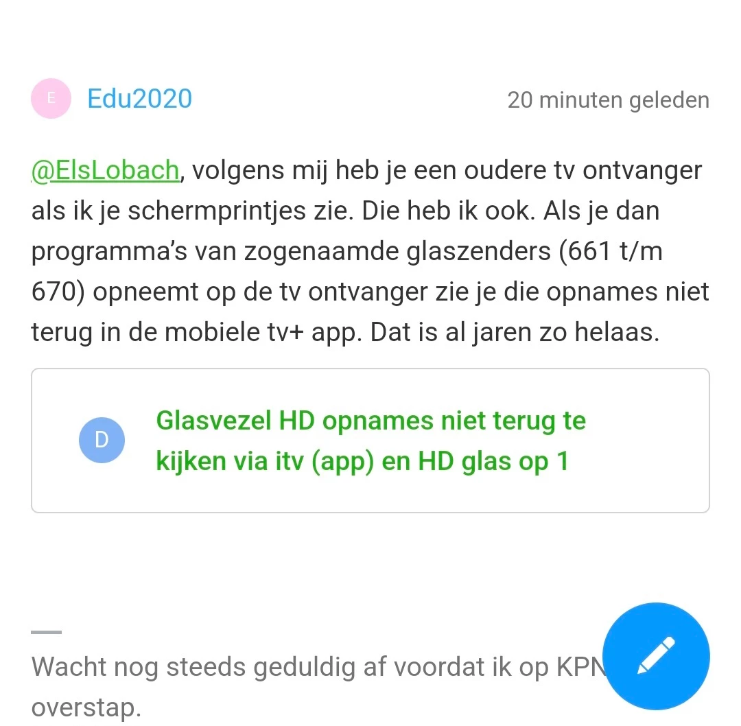 Aanvulling: wat ik probeer te zeggen is dat jij het zelfde verschijnsel hebt als initieel in dit topic beschreven is nl. geen opnames op je telefoon maar heeft een hele andere achterliggende reden. Met de update van de kpn tv+ app is voor mensen met een nieuwe tv+ box het nu opgelost maar jouw en ook mijn probleem zal niet opgelost worden omdat dat in de oude tv boxen zit icm glaszenders.