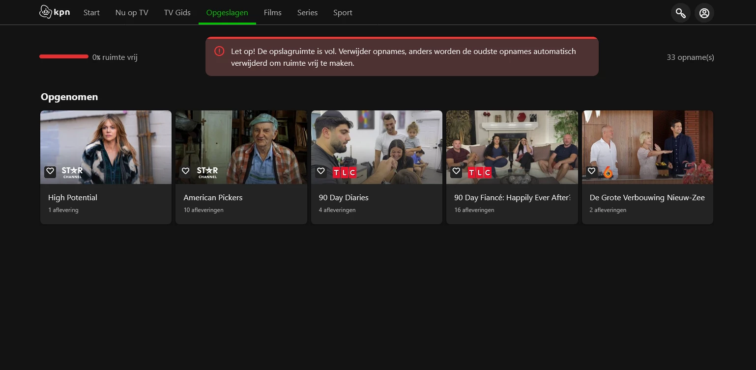 Je hebt 33 opnames. Daarmee moet die opslagruimte nog lang niet vol mee zijn. Dus ik denk dat hier een KPN medewerker naar moet kijken...