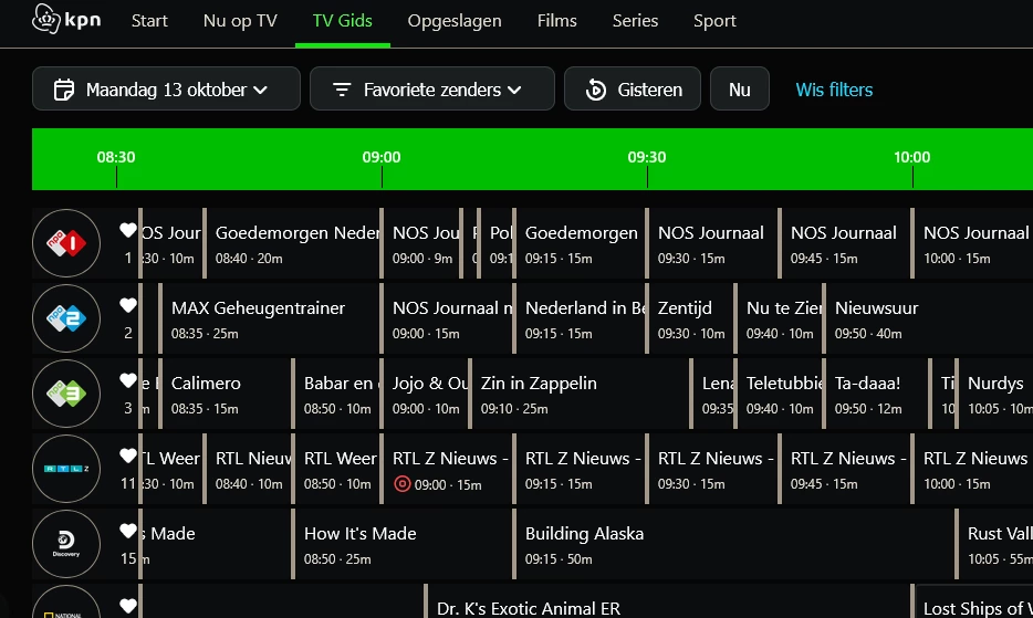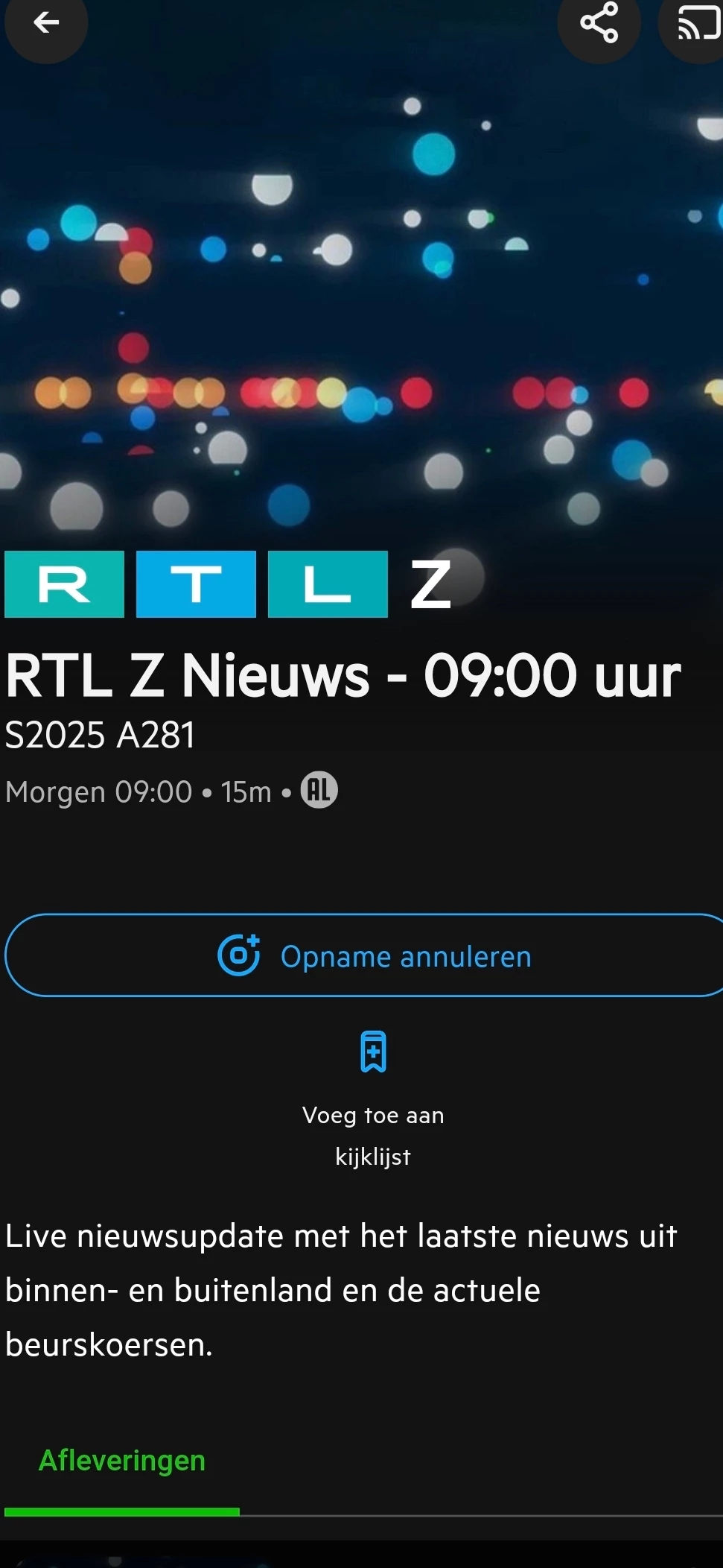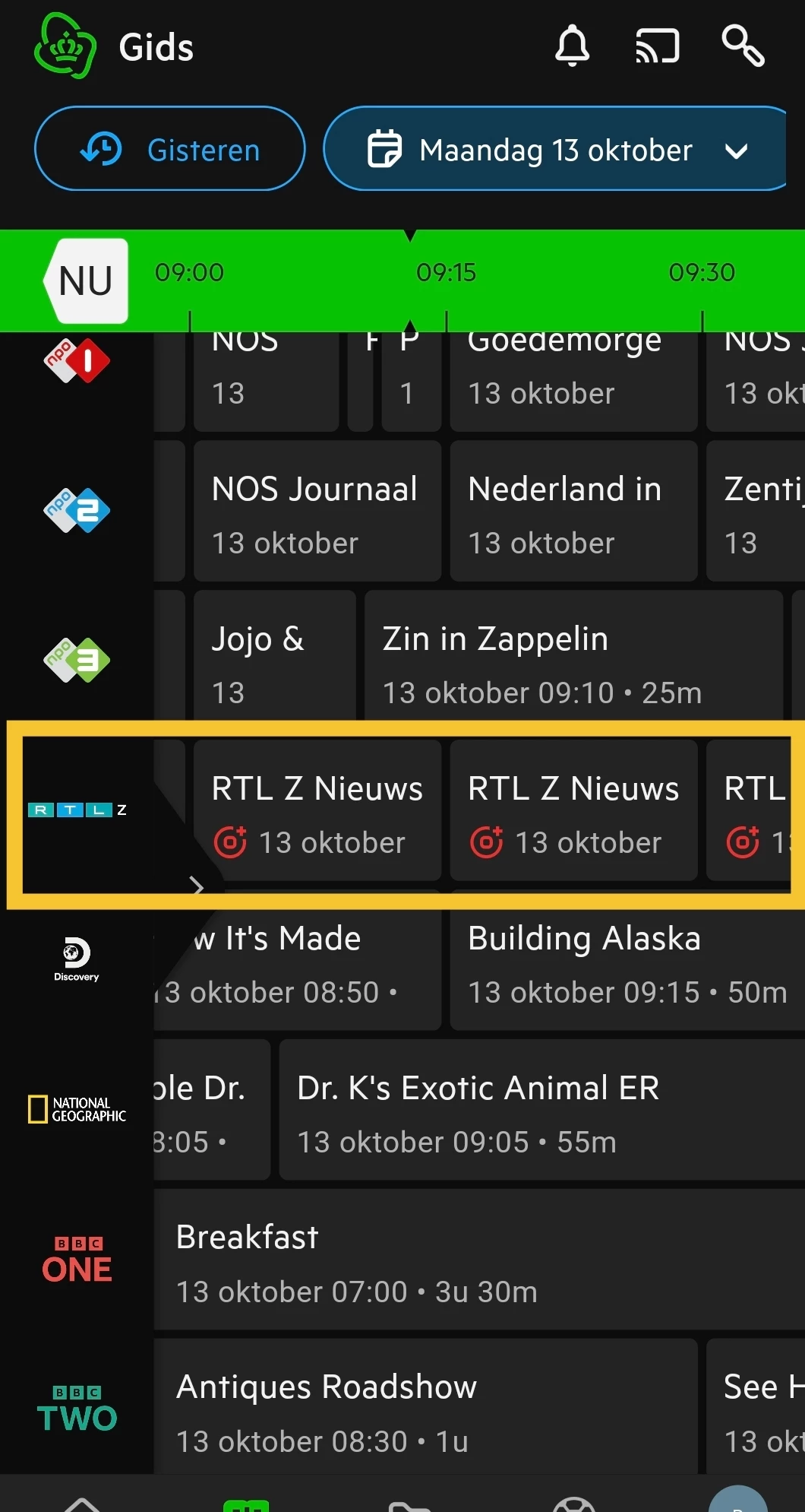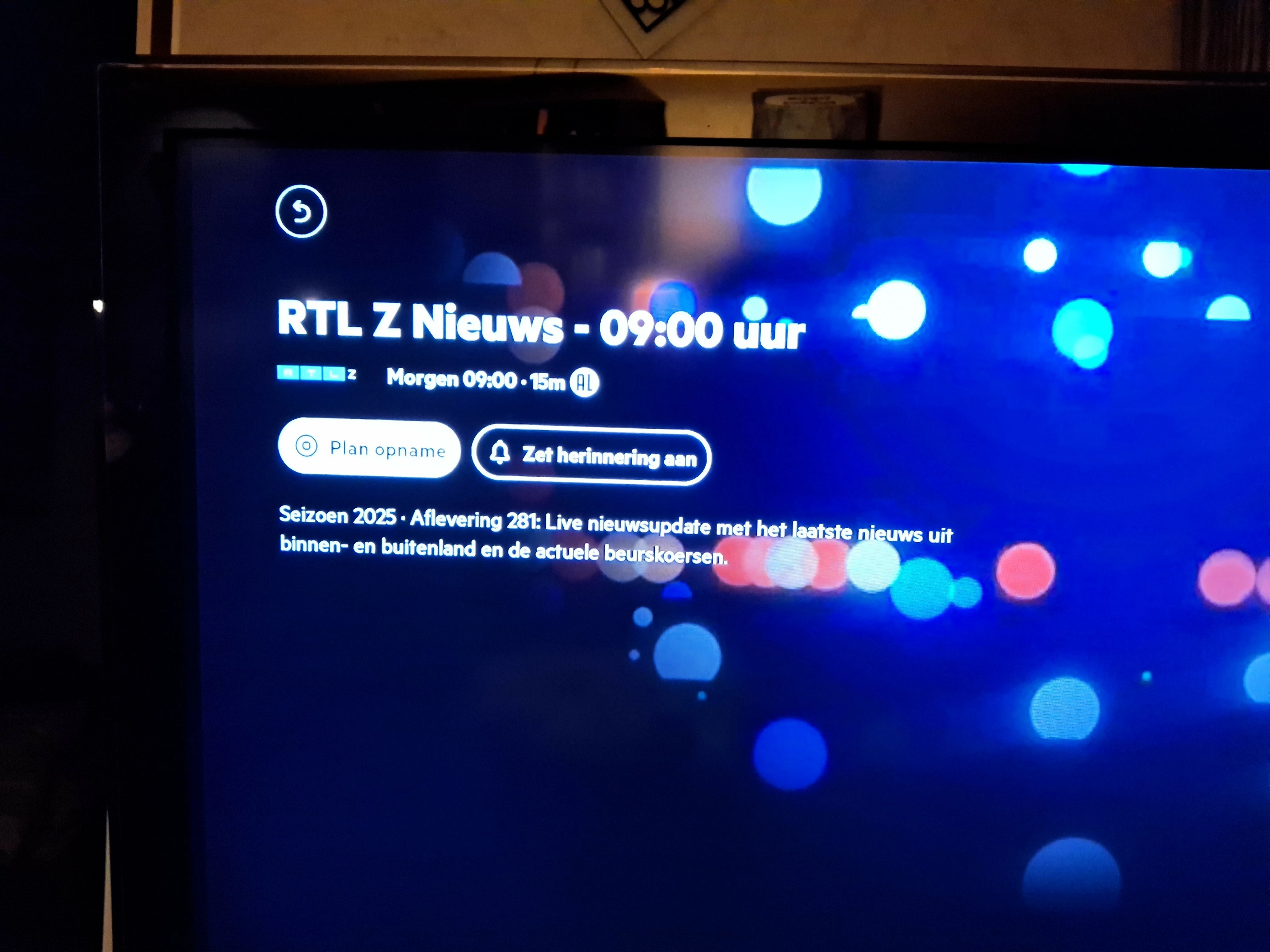 Ik ga met je meetesten als het mag. Ik heb zojuist RTL Z Nieuws als opname ingepland op maandag 13 oktober om 9 uur, 13 uur en 17:15 (programma heet in de gids 17:00).