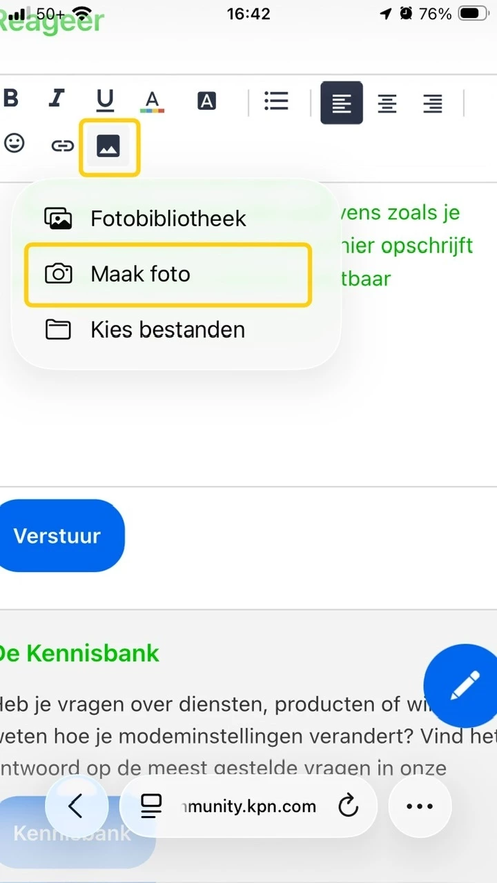 Het zou ook mooi zijn als er in het Reageer scherm een button was waarmee je de foto rechtstreeks van je GSM upload naar dat scherm.