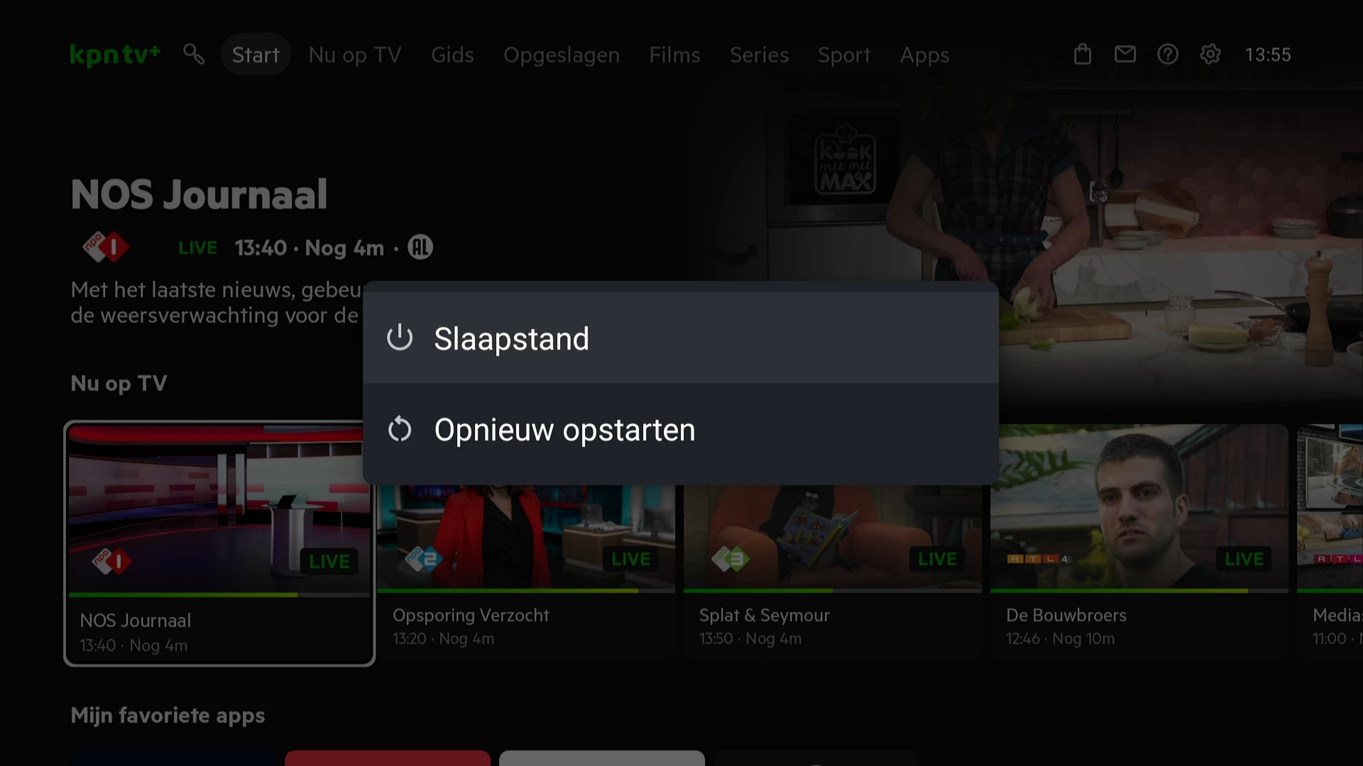 Heb je al eens geprobeerd de Soundbox opnieuw op te starten? Dat kan je doen door op de witte afstandbediening “KPN” lang ingedrukt te houden tot je onderstaande scherm ziet. Als je dan “opnieuw opstarten” selecteert, is die helemaal opgestart. Dat kan soms ook al helpen.