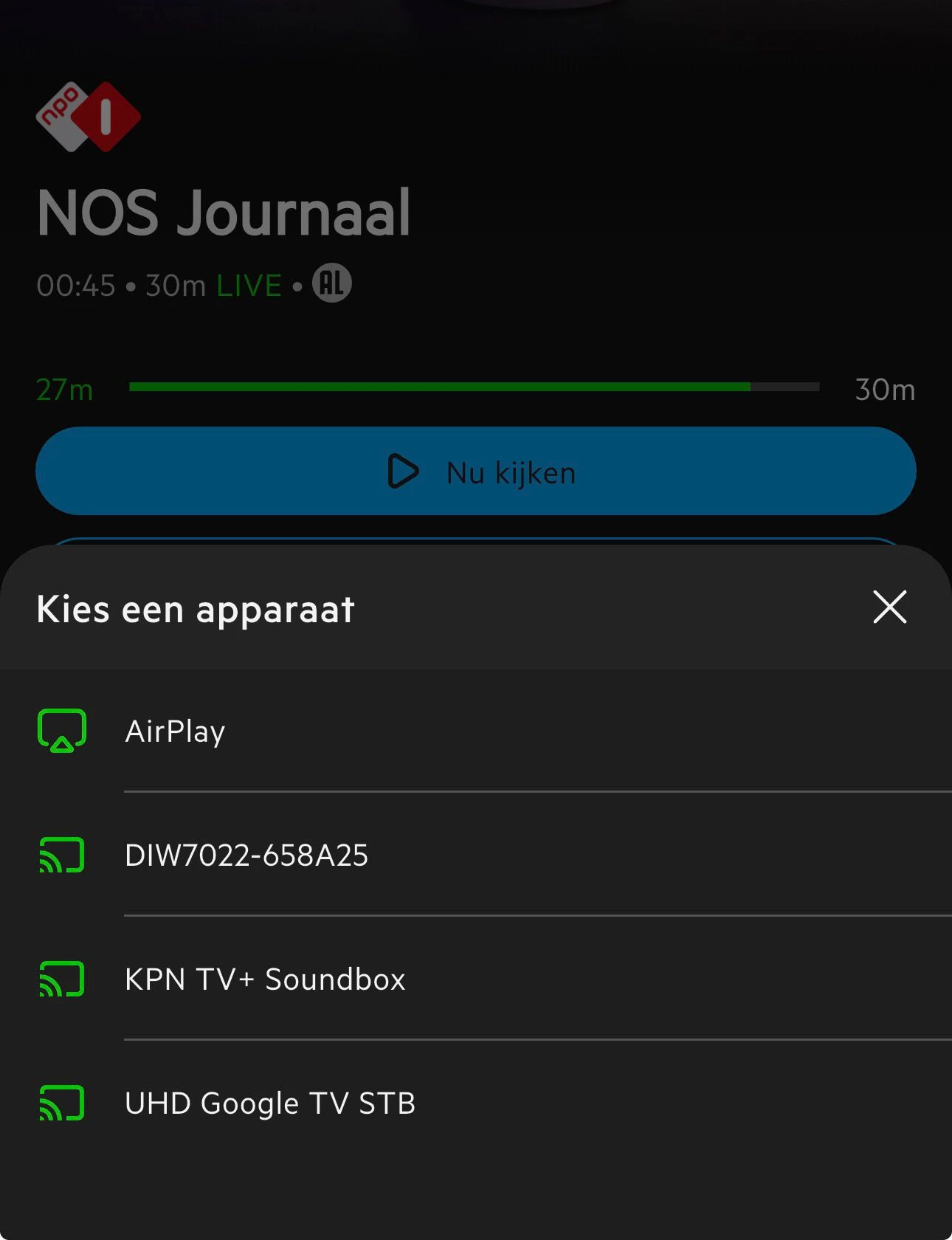 Bij het casten van een scherm op mijn macbook pro krijg ik een scherm dat ik kan casten via Chrom Cast of rechtstreeks naar de tv. Echter rechtstreeks naar de TV geeft de opmerking 'beschikbaar voor specifieke videosites'. Daar valt KPN TV blijkbaar niet onder, omdat de optie grijs is en ik dus niet kan aanklikken. Helaas.