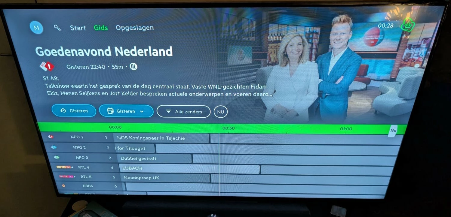 Daarbij komt dus ook nog het rare gedrag dat als ik voor 00:00 de gids open en een live zender selecteer, het programma gewoon live begint te spelen maar aan het einde stopt alsof ik een aflevering heb teruggekeken. Als ik de app dan sluit en weer start gedraagt het zich normaal.