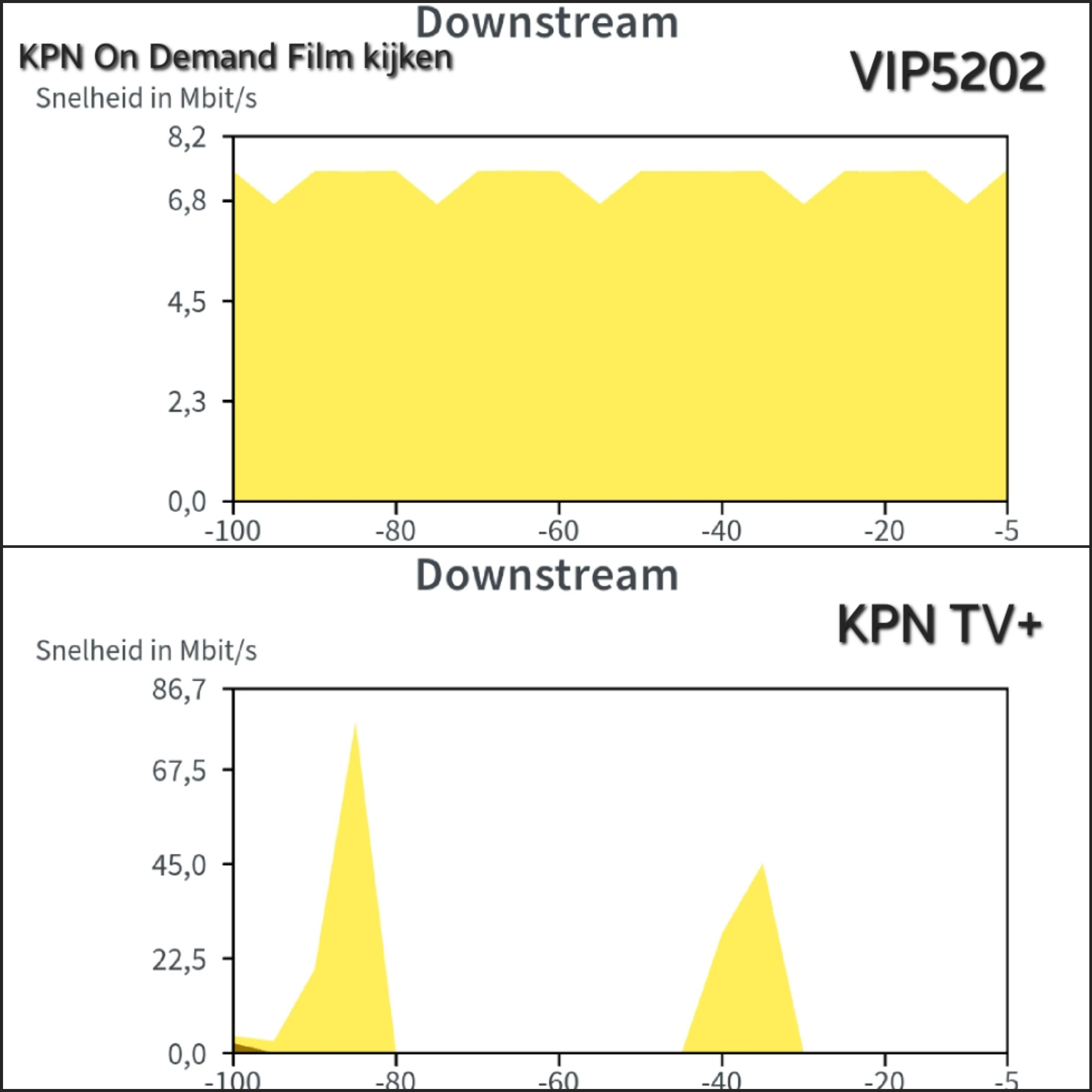 Je ziet dat op de VIP5202 een constante bitrate stream te zien is en de TV+ box bouwt ineens een grote buffer op waarbij de beeldkwaliteit minder van kwaliteit is en ook geen Dolby geluid aanwezig is bij alle films/series. Ik heb precies dezelfde film aangezet op de VIP5202 en op de TV+ box.