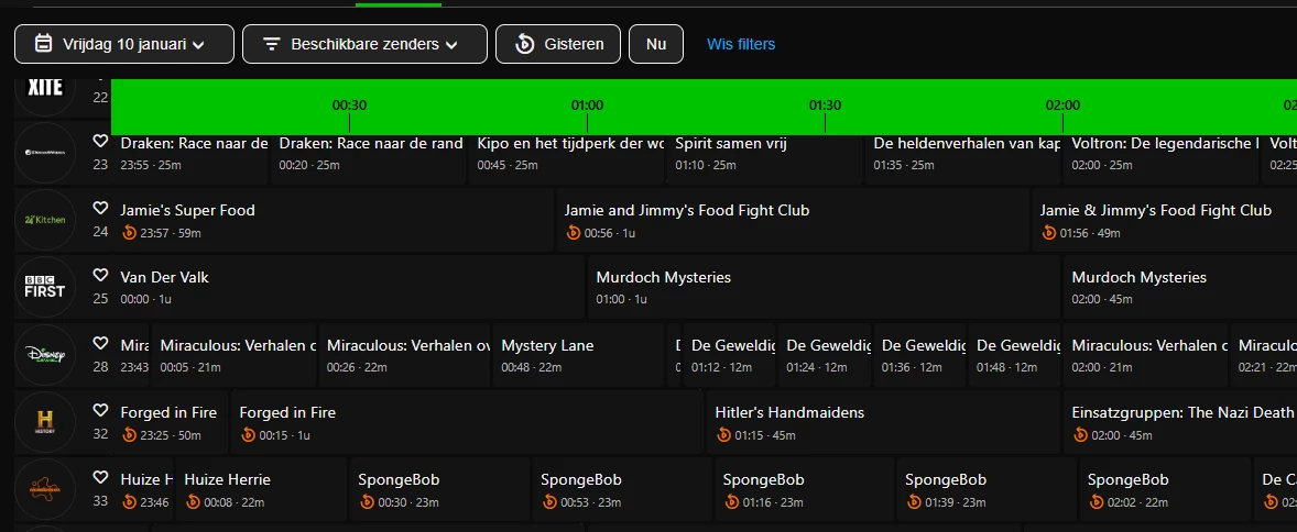 Dat zijn toch tijden dat ik nooit in de gids kijk… 😉. Wel eens af en toe rond 00:00 uur. Maar dat is dan weer vrijwel nooit op de laptop. Wel televisie (extra ontvanger) en de smartphone. Laptop is dan al lang uit; die ga ik er niet weer voor aanzetten.