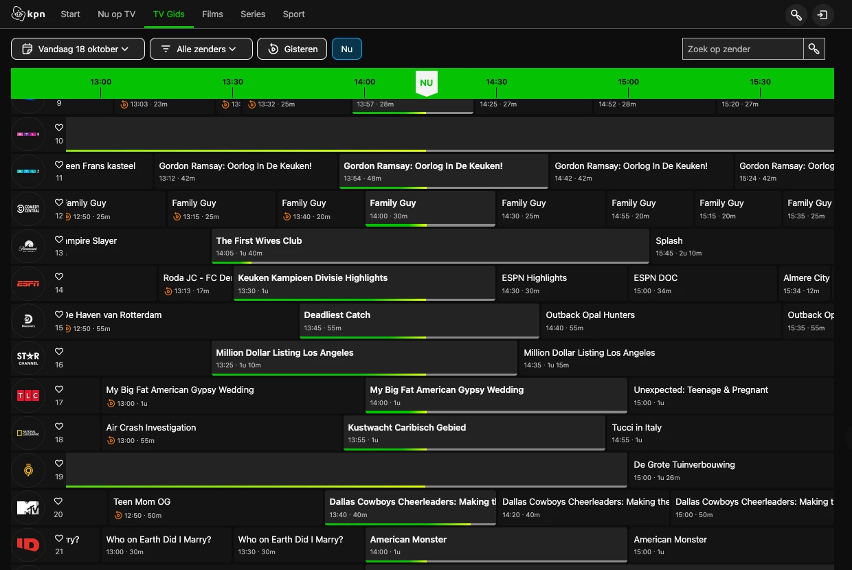 De begintijd van 13 Paramount Network, 14:05 uur, staat te ver naar links waardoor de voortgangsbalk te kort lijkt. Die van 20 MTV, 13:40 uur, staat juist teveel naar rechts, zodat de voortgangsbalk te lang lijkt. En van het langdurende Mediashop op RTL 8 is geen titel te zien.