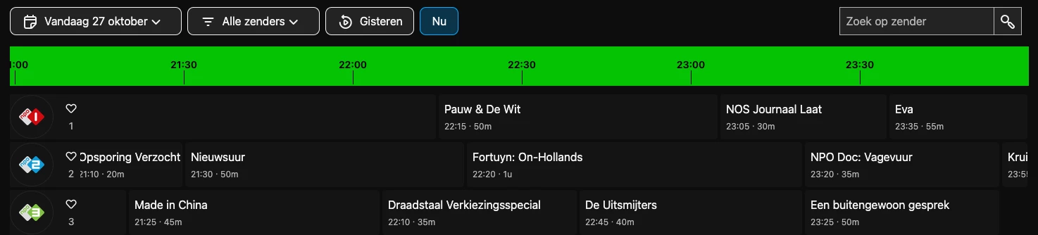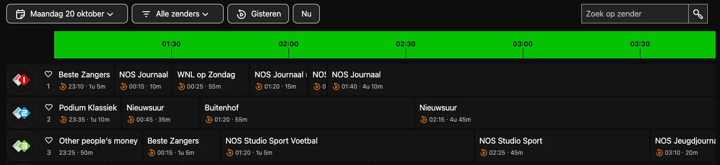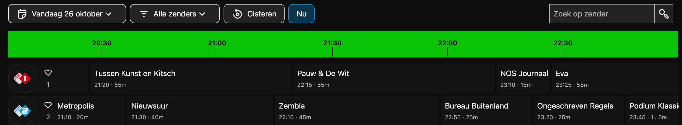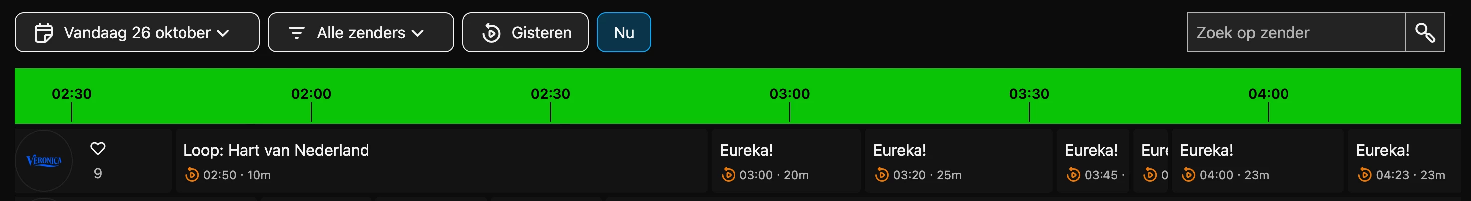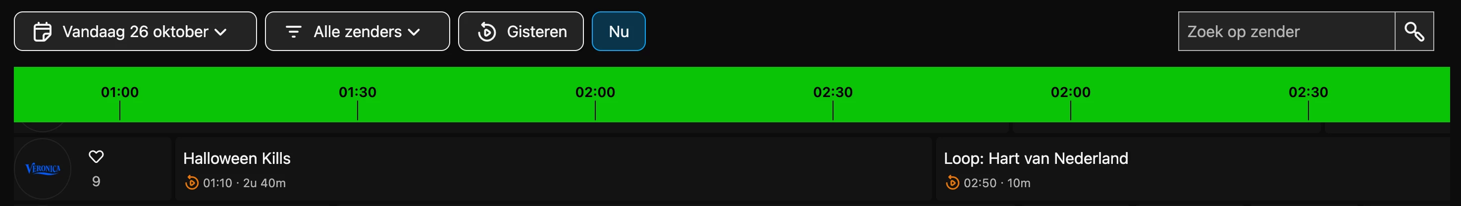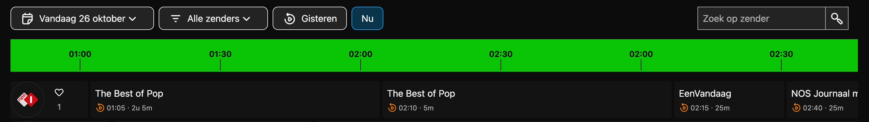 Dat issue is voor dagoverschrijdende programma's het geval en dat zijn er natuurlijk wel een hoop. De berekening voor de weergave van die balk doet dan net alsof het programma startte of eindigde om 00:00, i.p.v. de échte start of eindtijd te hanteren (buiten beeld). Daarom ziet dat er zo uit. Bug staat genoteerd en we zullen kijken of we het nog kunnen fixen 🤞.