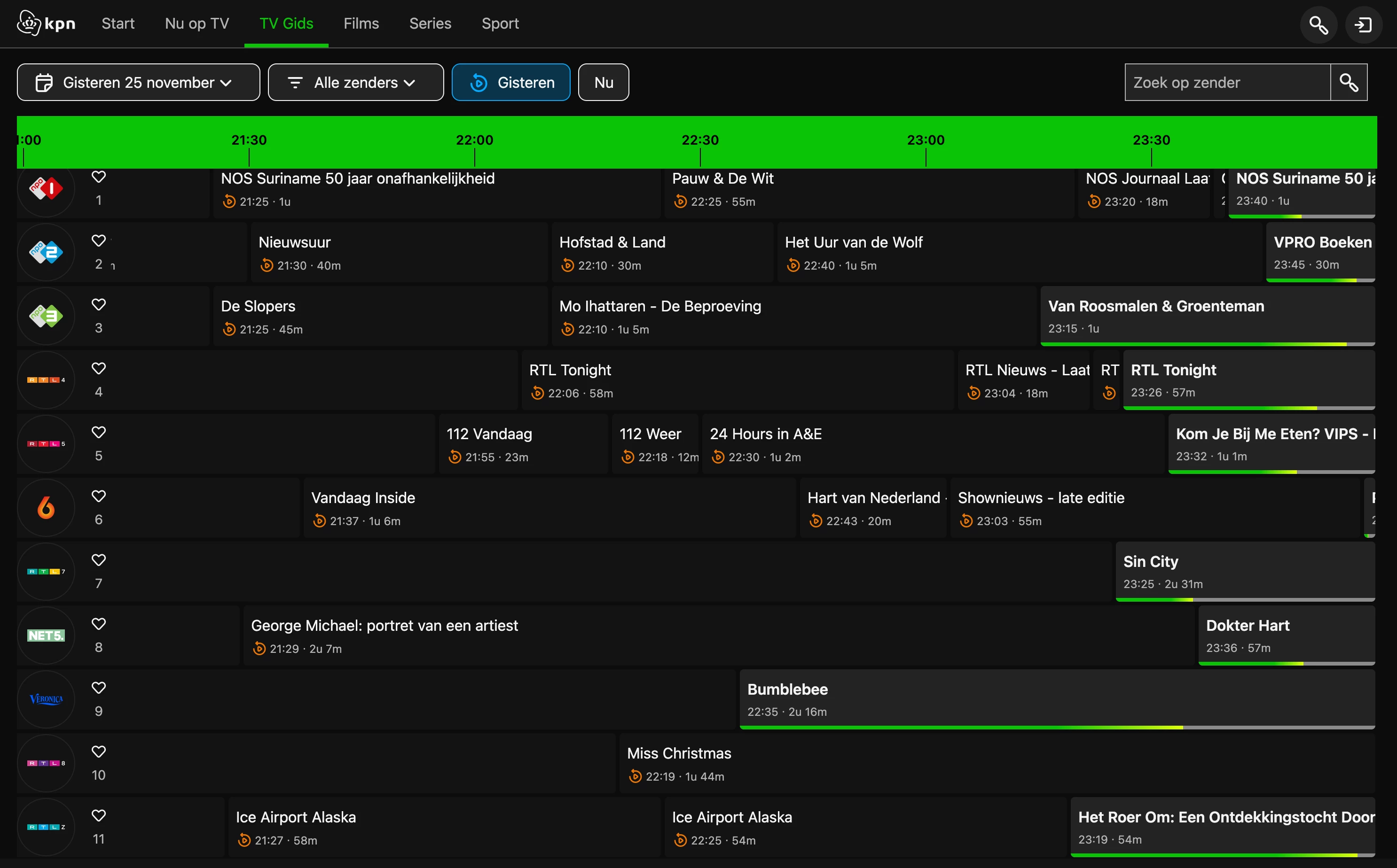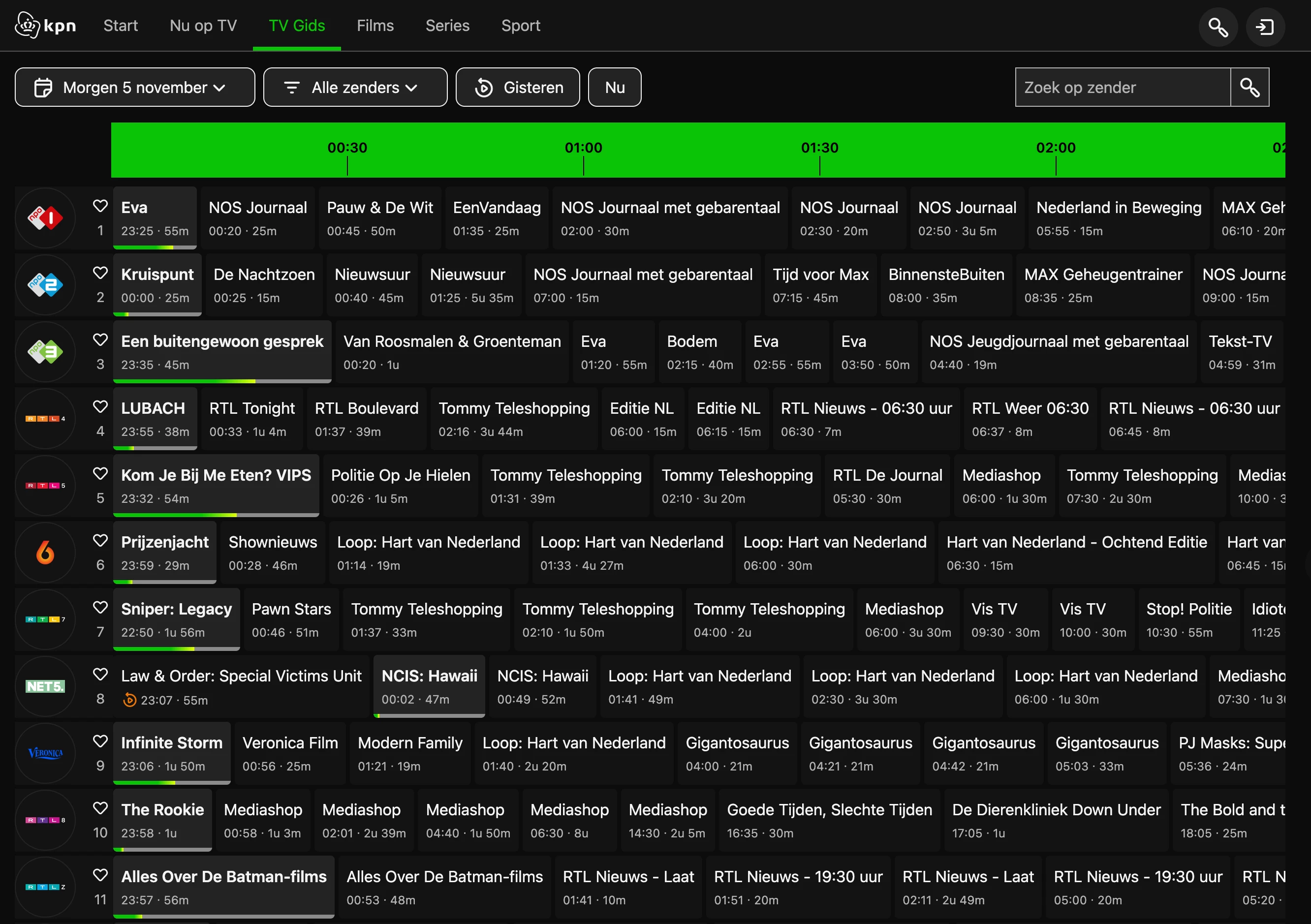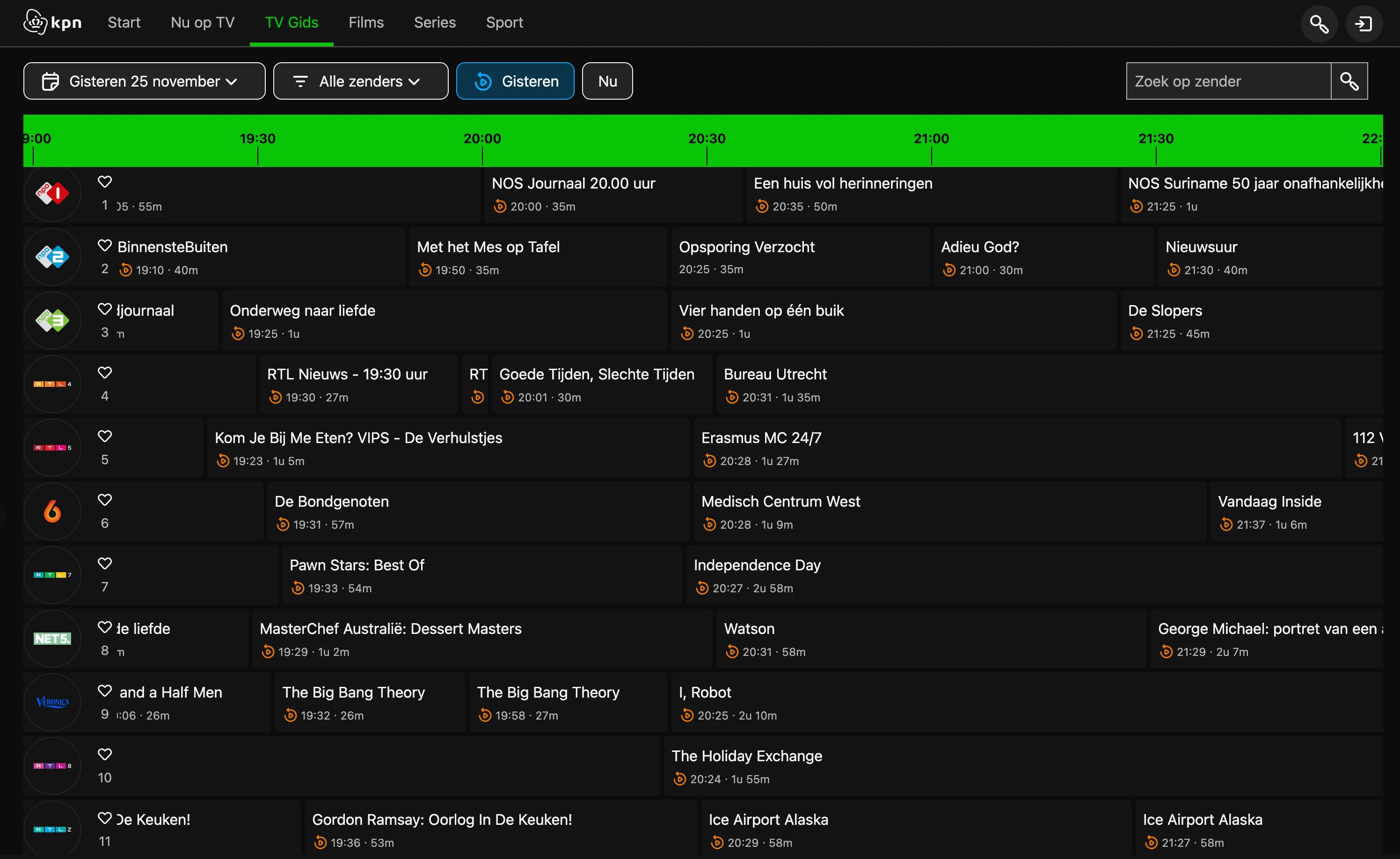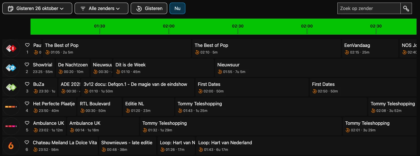 Gids op tv.kpn.com: leeg op primetime als je vlak na middernacht een dag teruggaat