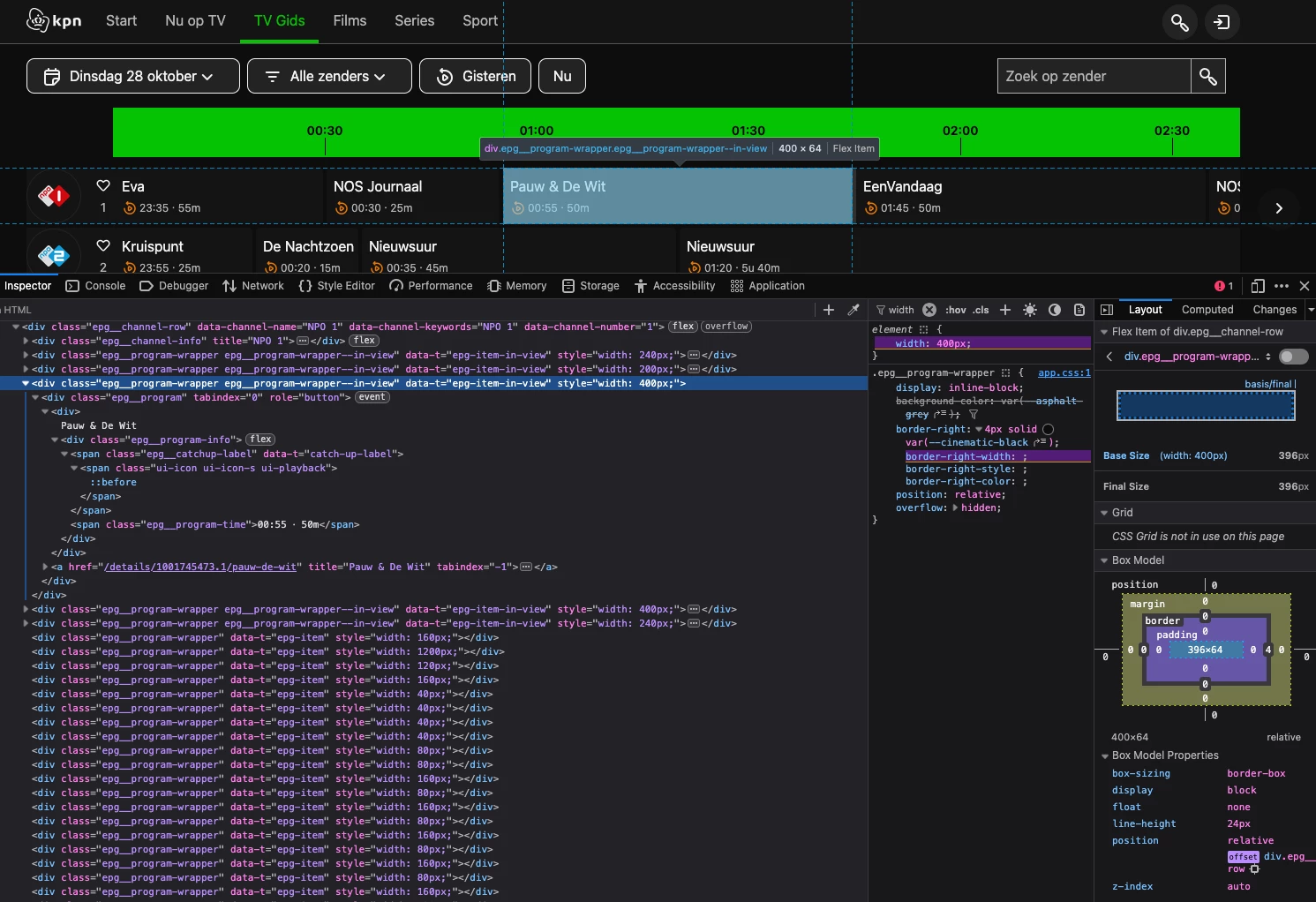 Ik zie trouwens geen extra foutmeldingen in de browser JavaScript console als de gids leeg lijkt doordat de style="width: ..." niet goed wordt toegevoegd. En ook de XHR-verzoeken om gidsinformatie lijken hetzelfde en gaan gewoon goed en ongeveer even snel. Het resultaat van die XHR-verzoeken is ook ongeveer even groot (als er al verschil is, dan lijkt de foute 0,5 MB kleiner?), maar misschien evengoed anders waardoor redelijk willekeurig wel/geen goede gids getoond wordt; dat kan een ontwikkelaar op dit moment mooi tijdens kantooruren uitzoeken.