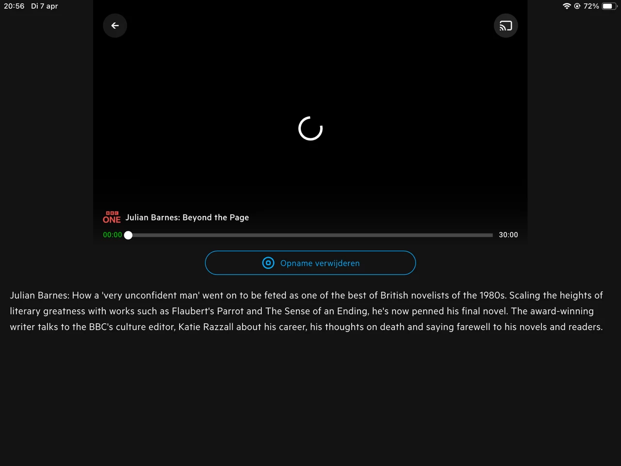 Op iPad willekeurige opname gestart, na ong. 1 minuut ronddraaiende laad-cirkel start het afspelen uiteindelijk. Dezelfde opname start wél direct met afspelen op (Arris) tv ontvanger.