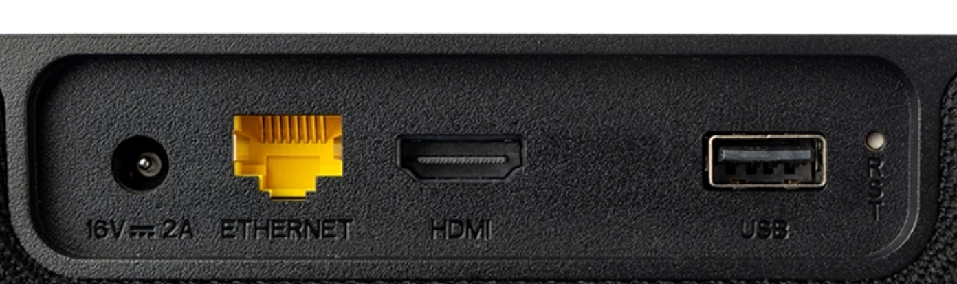 Je kunt eventueel via Bluetooth wel een externe speaker aansluiten, maar verder zijn er geen externe aansluitmogelijkheden, behalve de HDMI naar de tv zelf en een LAN-poort voor een bekabelde verbinding naar de modem/router: