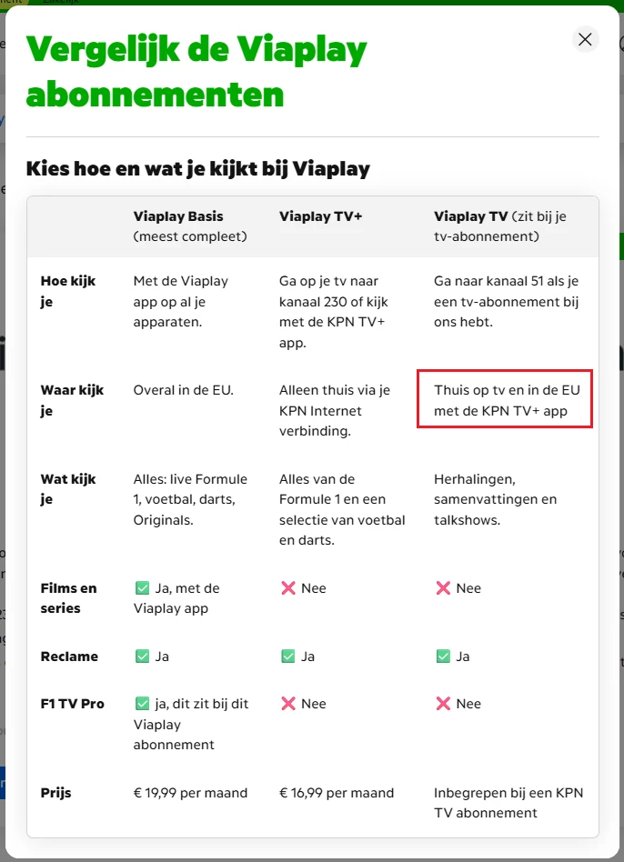 Viaplay TV (kolom 3) kan ook gekeken worden buiten de deur via de app en tv.kpn.com.