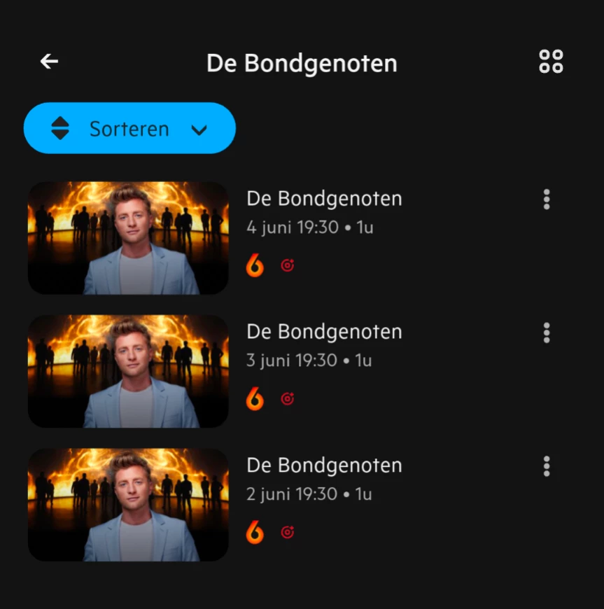Volgende week gaat het op 2 dagen mis bij het programma de bondgenoten. Deze staat standaard als serie opname en zou dus 5 toekomstige opnames moeten zien aangezien het iedere werkdag komt. Ik zie er echter maar 3 bij mijn geplande opnames staan. De aflevering van donderdag 5 juni heeft hetzelfde afleveringsnummer (161) als die van maandag 2 juni. De aflevering van vrijdag 6 juni heeft afleveringsnummer 162, hetzelfde als die van dinsdag 3 juni